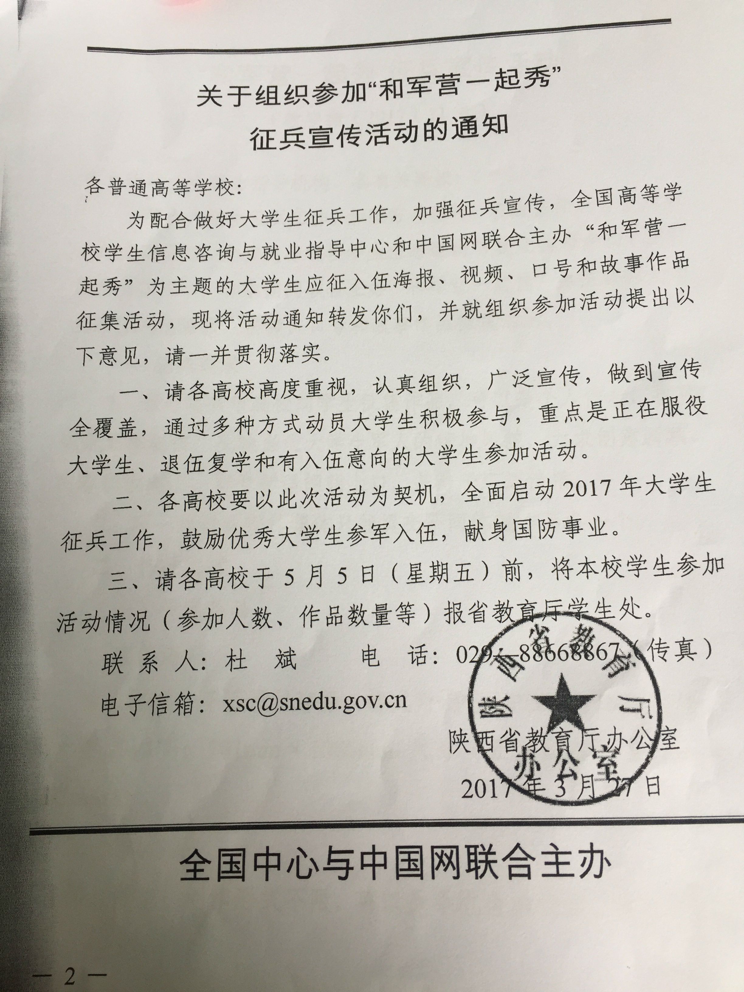 依据陕西省教育厅2017年3月27日文件通知及院领导批示精神,为配合做好大学生征兵工作,加强征兵宣传,全国高等学校学生信息咨询与就业指导中心和中国网联合主办“和军营一起秀”为主题的大学生应征入伍海报、视频、口号和故事作品征集活动。为了搞好我院“和军营一起秀”征兵宣传活动: