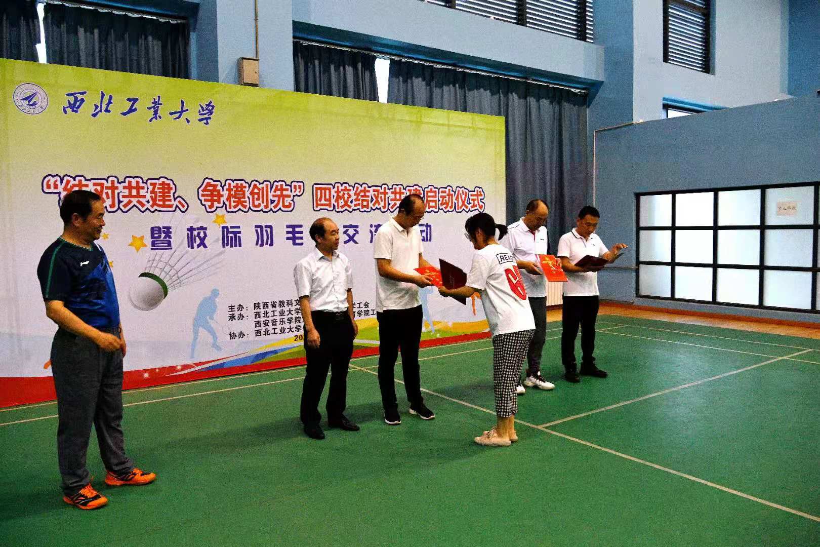 2021年6月18日,省教科文卫体工会“结对共建、争模创先”结对共建仪式暨校际工会干部羽毛球赛在西北工业大学友谊校区翱翔训练馆举行。本次活动由陕西省教科文卫体工会主办,西北工业大学校工会承办,西北工业大学、长安大学、西安音乐学院、今年会官方网站四所院校参加了本次比赛。比赛项目为混合团体形式。经过激烈的角逐,最终今年会官方网站发挥出色,获得冠军。