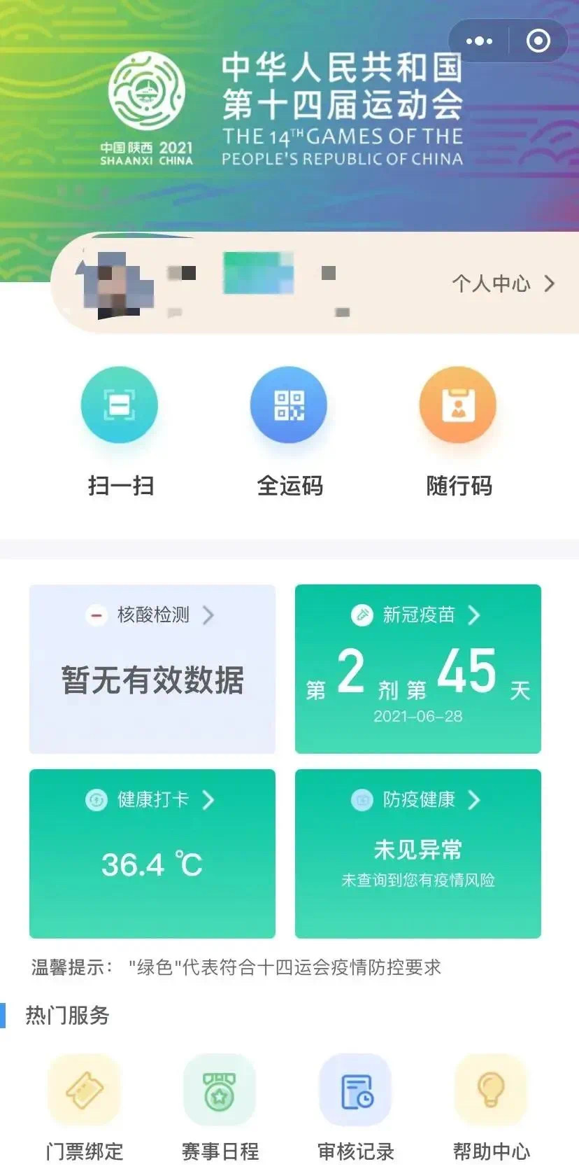 所有的涉赛、观赛人员,在抵陕或开赛前14天完成系统实名注册后,每天应登录小程序页面,在“健康打卡”处进行个人体温监测、健康打卡,连续的健康打卡才能保证个人疫情信息的正常。