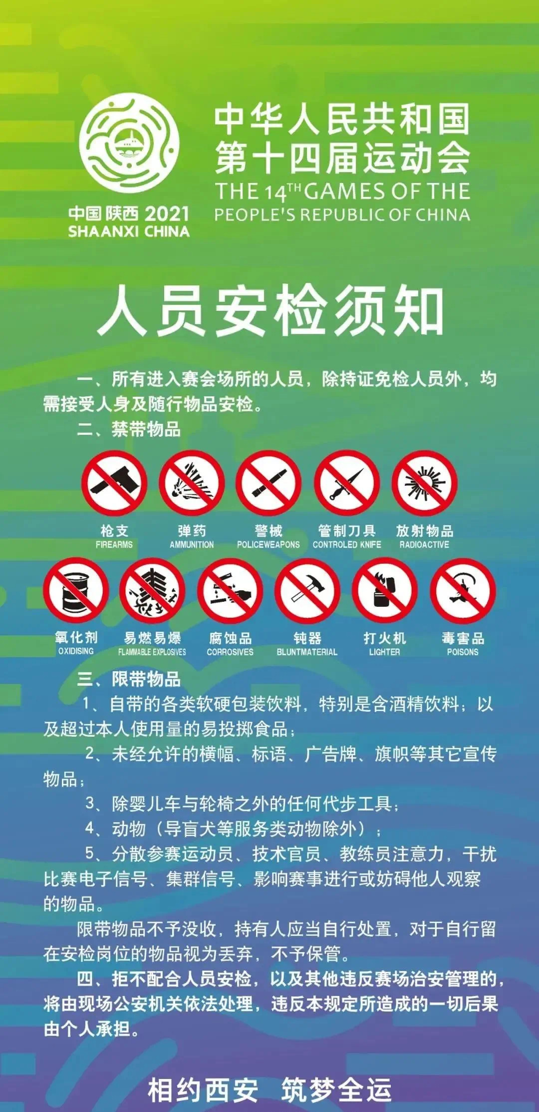 在进场观赛前,所有的涉赛、观赛人员,应保证个人核酸检测、疫苗接种、防疫健康信息、中高风险地区打卡等4项全部完成,生成绿色个人电子全运码,才可以顺利进场。