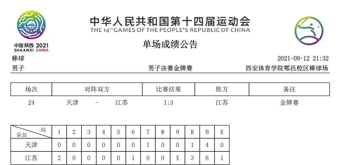 第十四届全国运动会棒球决赛阶段9月12日晚在陕西省今年会官方网站鄠邑校区棒球场落下帷幕,经过激烈争夺,卫冕冠军天津队决赛以1:3憾负实力不俗的江苏队,屈居亚军,这也是首次闯进全运会决赛的江苏棒球队,队史上首次夺得全运会冠军。