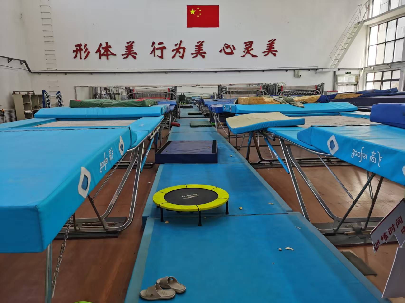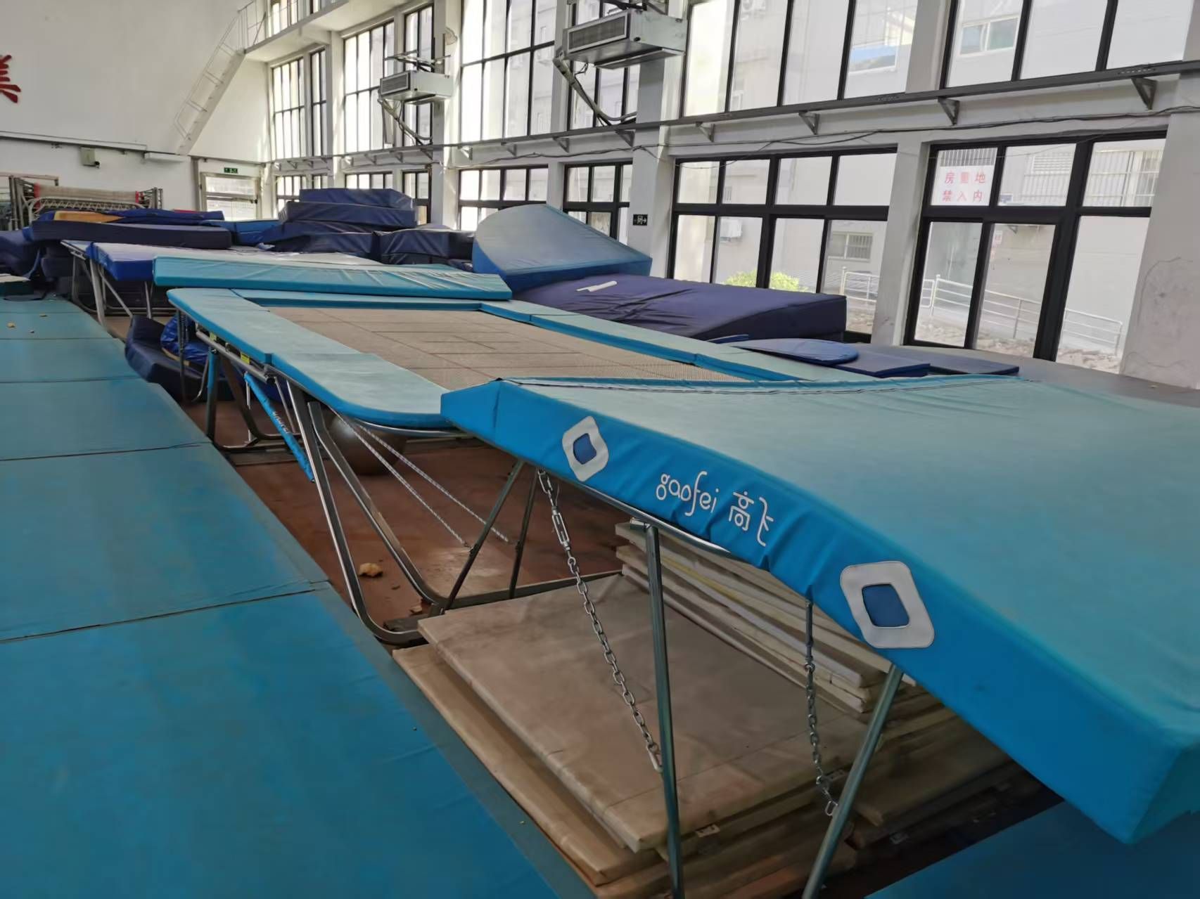经国有资产管理处研究决定,出让我校体操馆蹦床体育器材共11台件,有意向的单位前来洽谈。如图所示: