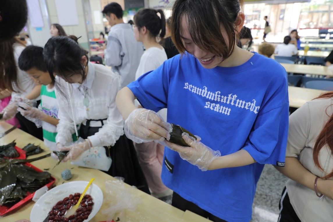 活动现场,老师、学生与后勤工作人员一起动手体验包粽子,为大家发香包、送艾叶,在亲身体验的过程中感受传统佳节的文化氛围,活动现场大家有说有笑,其乐融融。