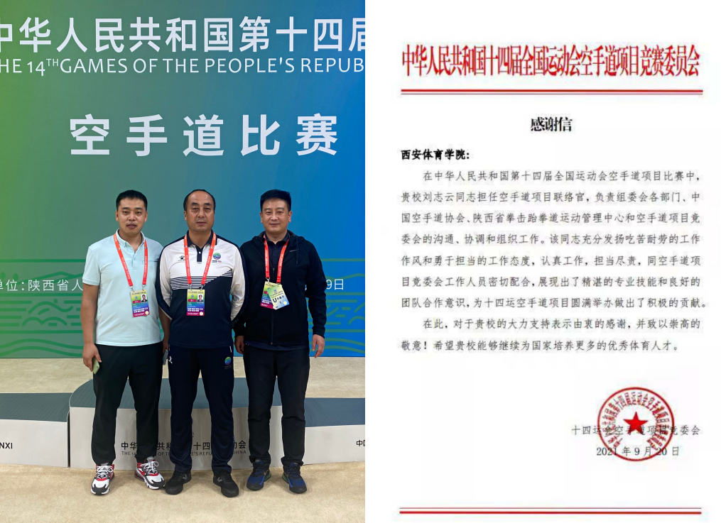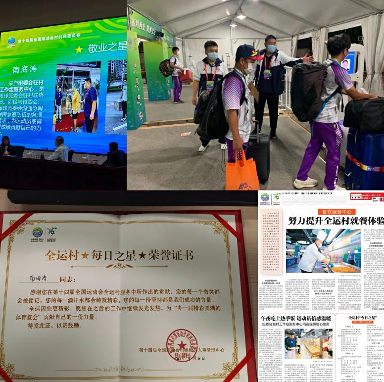 运动训练学院张佩莉、郑峰、于昕、黄环、张龙、王伟、南海涛、刘志云等20余名师生分别在手球、曲棍球、棒球、垒球、橄榄球、蹦床、游泳、田径、空手道等项目竞委会担任不同的岗位,他们坚守岗位,履职尽责,圆满的完成了比赛任务,受到了各项目竞委会的一致好评。学院辅导员南海涛是棒球竞委会驻村联络员,积极与村委会、棒球竞委会沟通协调,保障参赛队伍各项需求,为运动员取得好成绩贡献自己的力量,被全运村授予“敬业之星”荣誉称号;2019级学生朱子彤,在第十四届全国运动会蹦床、艺术体操项目竞委会竞赛组织处工作,担任蹦床、艺术体操竞委会驻全运村联络员一职,该同志奉献精神强,封闭食宿在全运村,不讲困难、不提条件、加班加点、默默奉献,利用个人专业优势出色的完成了技术官员在全运村的服务保障工作和竞委会交办的其他竞赛组织工作,体现出极佳的专业素养,获得了竞委会和全运村的高度认可,被全运村授予“党员保赛模范岗和每日之星”荣誉称号;学院党政办公室副主任刘志云,在十四运会担任空手道项目联络官,他尽职尽责,勇于担当,积极与组委会、中国空手道协会、省拳跆中心及项目竞委会沟通协调,同空手道项目竞委会工作人员密切配合,为十四运空手道项目圆满举办做出了积极的贡献,受到了空手道项目竞委会的感谢。