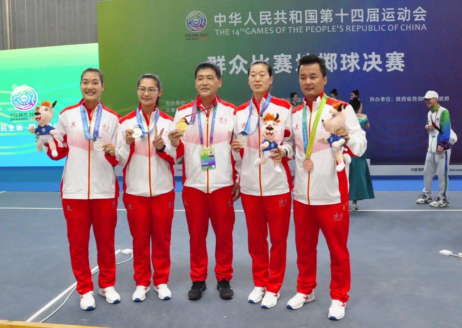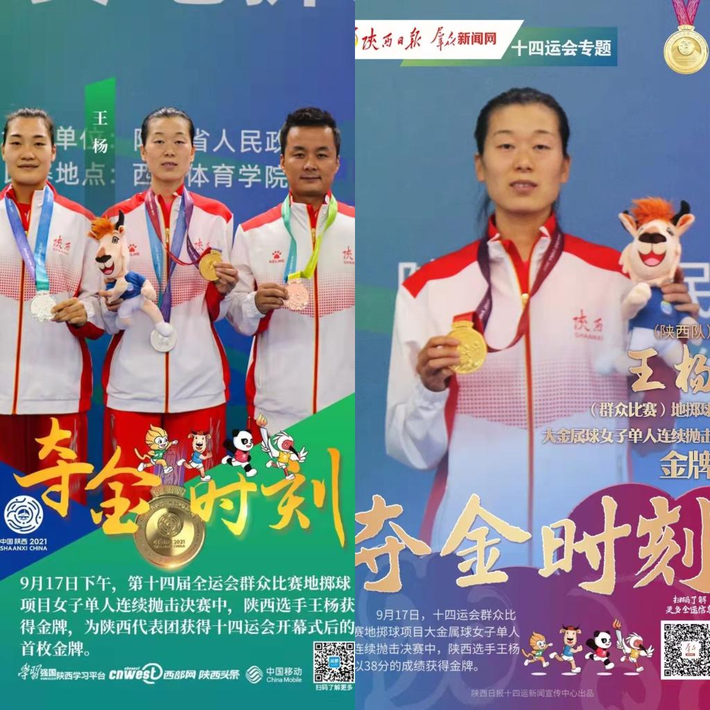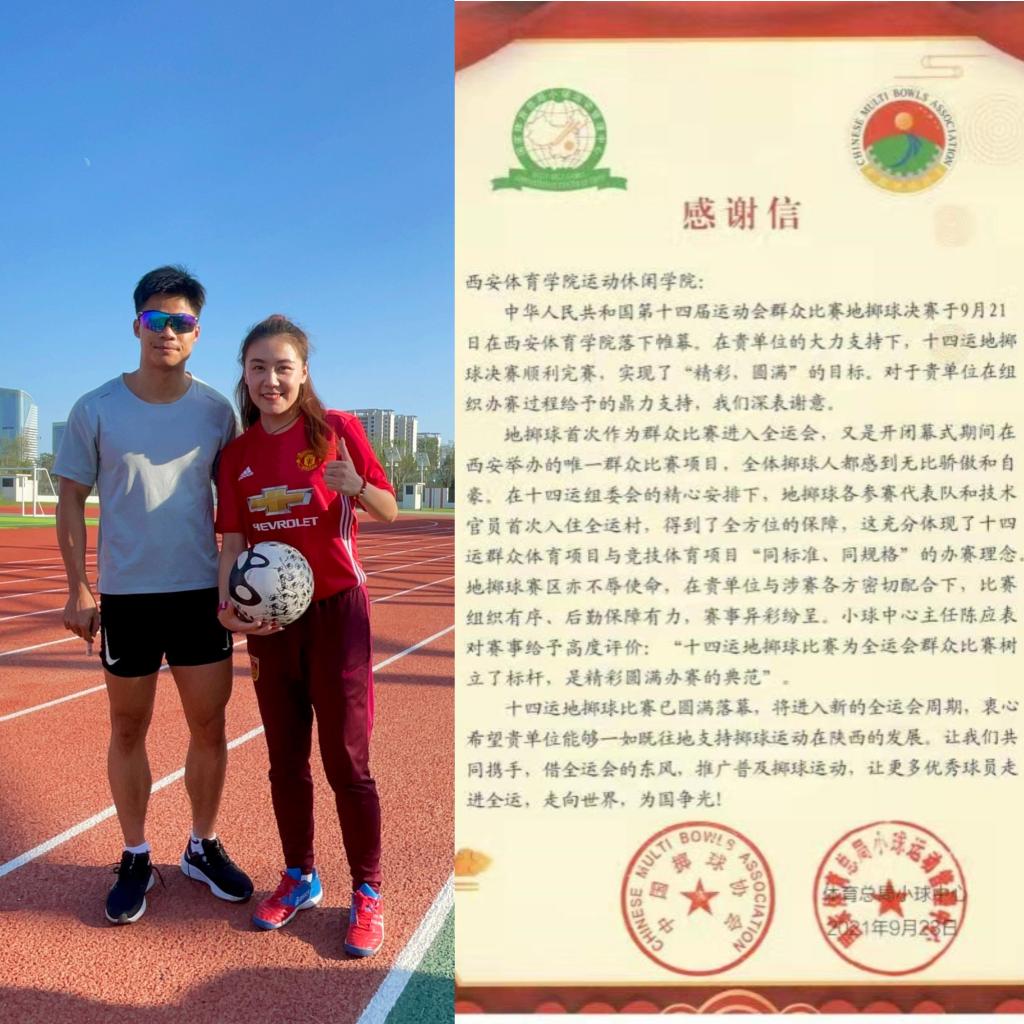 在全力支持办赛工作的同时,我院参赛教师也取得了骄人的战绩。学院教师索文涛、王杨、赵厦代表陕西省地掷球队参加全运会群众比赛地掷球决赛;其中王杨获得女子单人连续抛击金牌,王杨和赵厦获得女子双人连续抛击银牌,索文涛获得男子准确抛击铜牌,王杨、赵厦和程坤获得塑质球女子三人赛铜牌,捍卫了今年会在中国地掷球项目的优势地位!