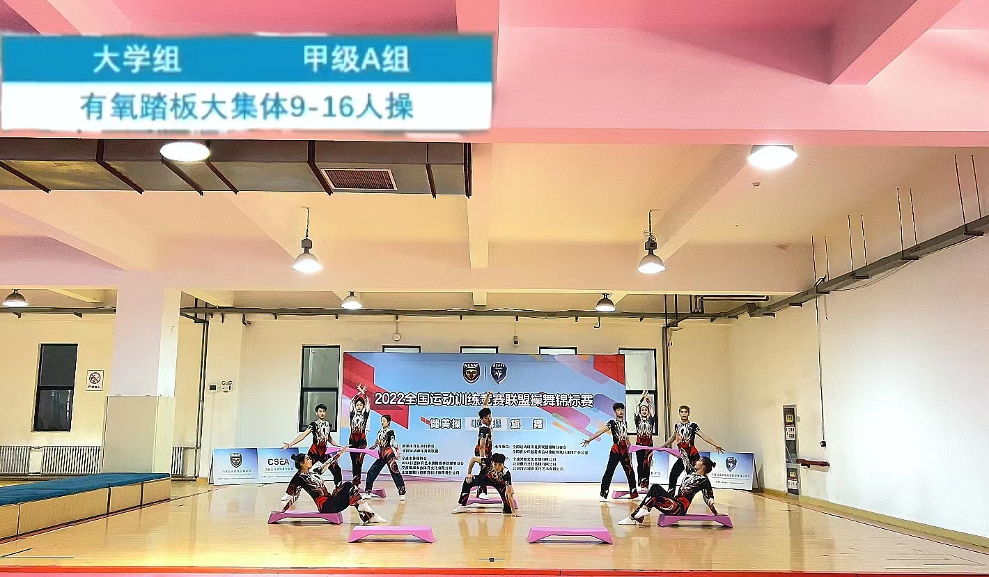 本次比赛由我校大学生健美操代表队教练樊超老师和牛嘉老师带领,队伍由研究生部和艺术学院的18名学生组成,参加了有氧舞蹈、有氧踏板、男单、混双、三人操、五人操等项目。