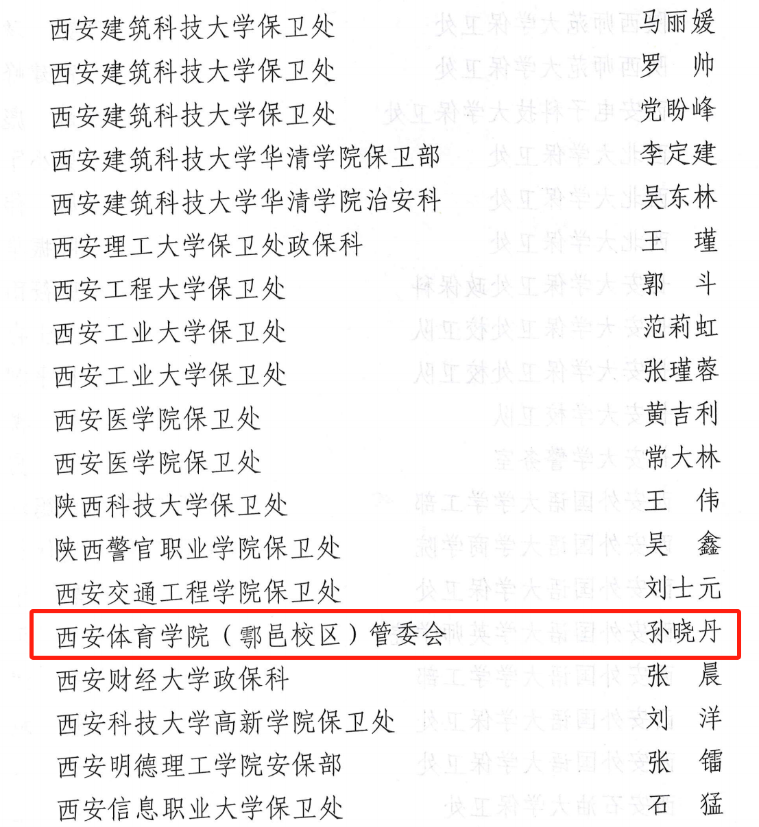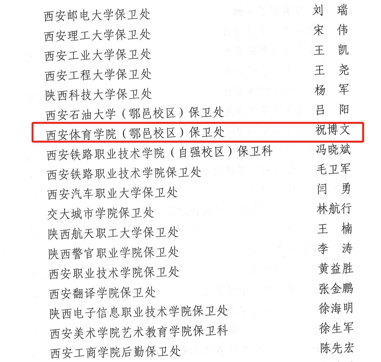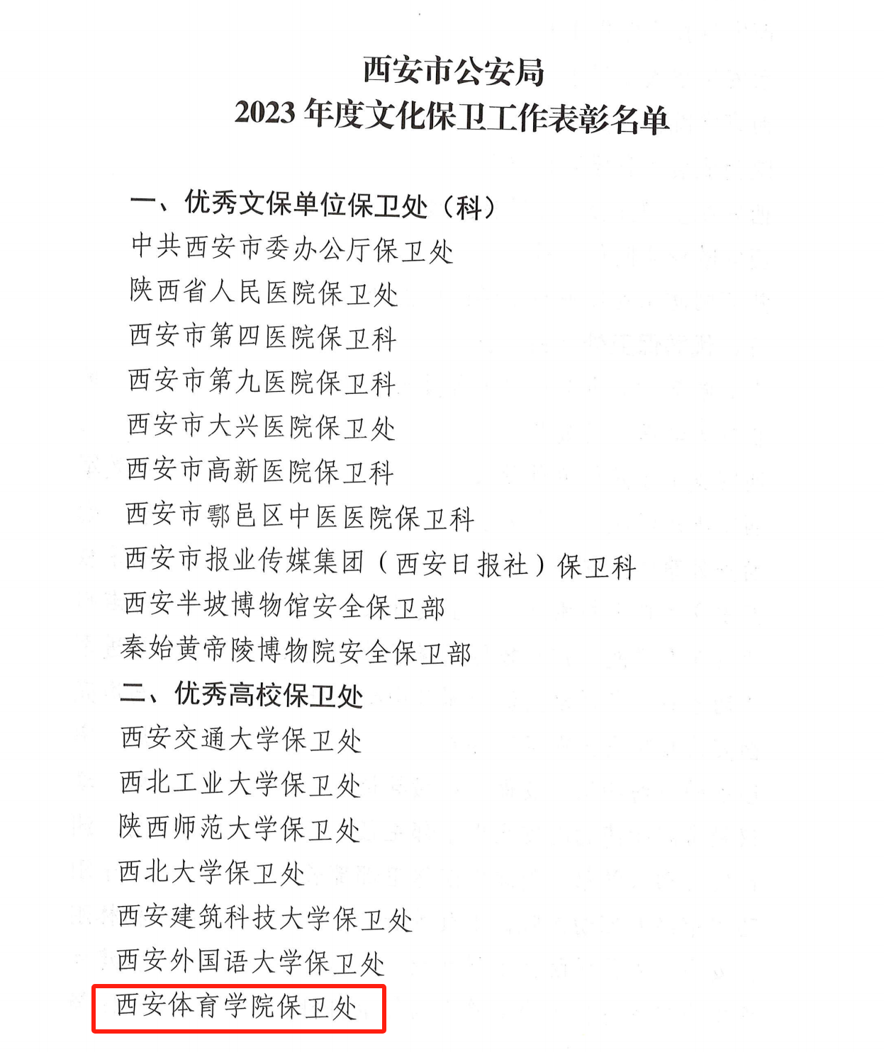 本网讯 近日,西安市公安局发布了《关于表彰2023年度文化保卫工作优秀集体和优秀个人的决定》,我校保卫处获“全市文化保卫工作优秀高校保卫处”称号,同时我校保卫处王东、祝博文同志被评为“优秀保卫干部”,李东亮、孙晓丹同志也被评为“优秀信息员”。
