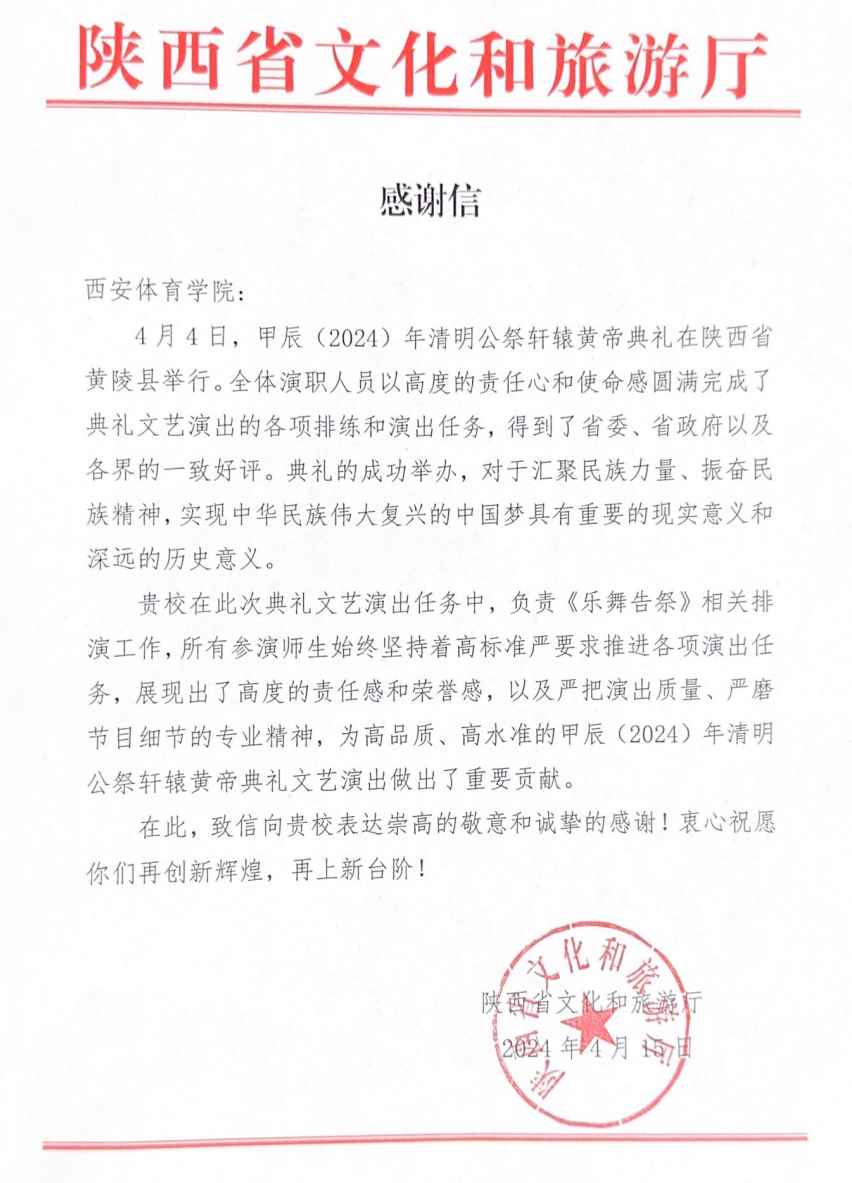 据悉,我校连续9年参加清明公祭轩辕黄帝典礼演出,累计参演人数达500余人。4月15日,我校收到陕西省文旅厅感谢信,指出,公祭典礼受到省委、省政府及各界一致好评,表扬我校师生在排演的《乐舞告祭》节目中始终以高度的责任感和荣誉感,坚持高标准、严要求推进各项演出任务,对师生严把演出质量、严磨节目细节的专业精神表示高度肯定,感谢我校为高品质、高水准的文艺演出做出的重要贡献,并希望学校再创新辉煌,再上新台阶!