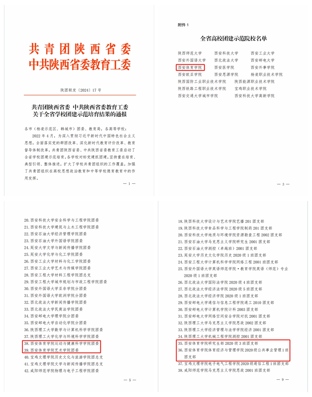 本网讯    近日,共青团陕西省委、中共陕西省委教育工委公布《关于全省首批新时代高校团建示范创建结果的通报》(陕团联发〔2024〕17号),我校入选全省高校团建工作示范院校,运动与健康科学学院团委、艺术学院团委入选全省高校团建工作标杆院系,研究生部2020级3班团支部、体育经济与管理学院2020级公共事业管理1班团支部入选全省高校团建工作样板团支部。