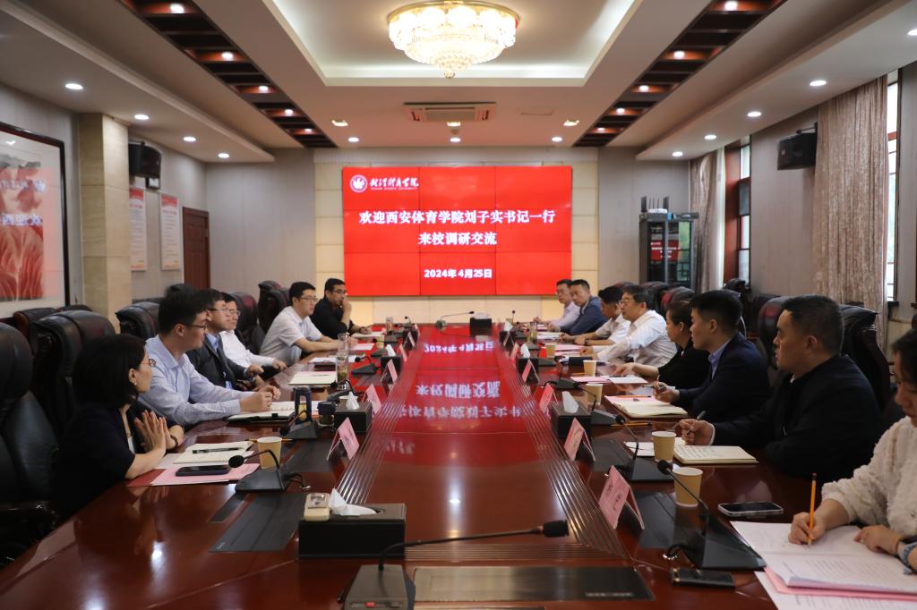 本网讯 4月25日,党委书记刘子实带队赴武汉体育学院调研干部队伍建设、人才队伍培养以及分类考核等工作,我校副校长谢英,党委校长办公室、组织部、人事处、发展规划处负责人一同参加调研。武汉体育学院党委书记陈继平、副校长刘彦博,相关部门负责人参加座谈交流。