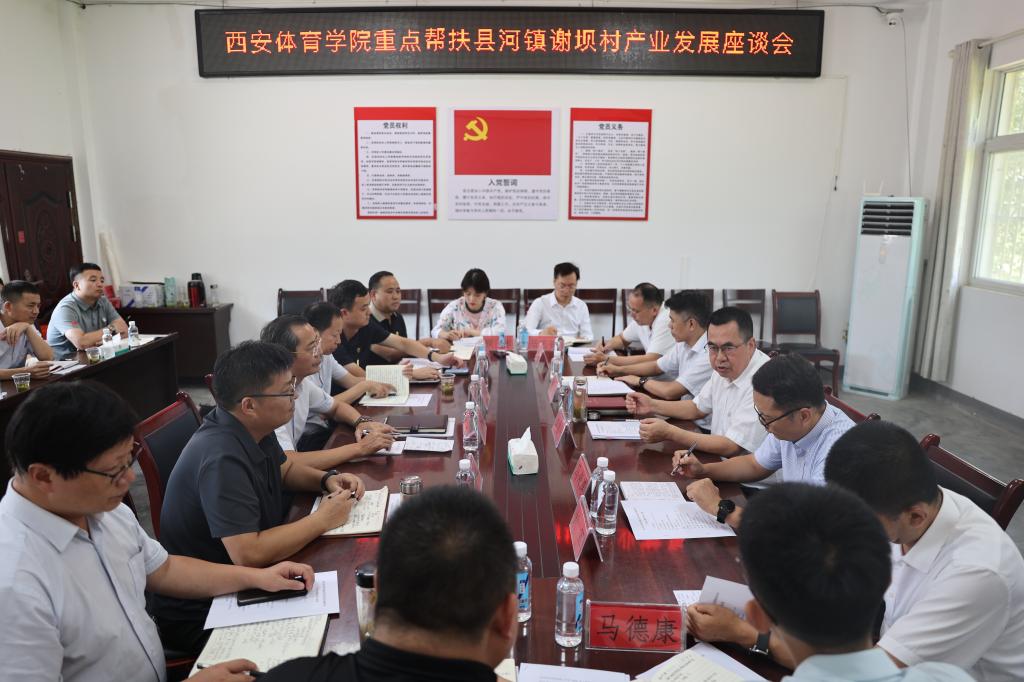 在谢坝村村委会会议室召开的产业发展座谈会上,汉滨区区委常委、宣传部部长冯荣平对我校长期以来支持汉滨区教育、体育、医疗等方面的发展表示感谢。他提出建立产学研基地等建议,希望西安体院在体育赛事、生态旅游、全民健身、体育康养等方面为汉滨区共绘体育强区发展蓝图提供大力支持。