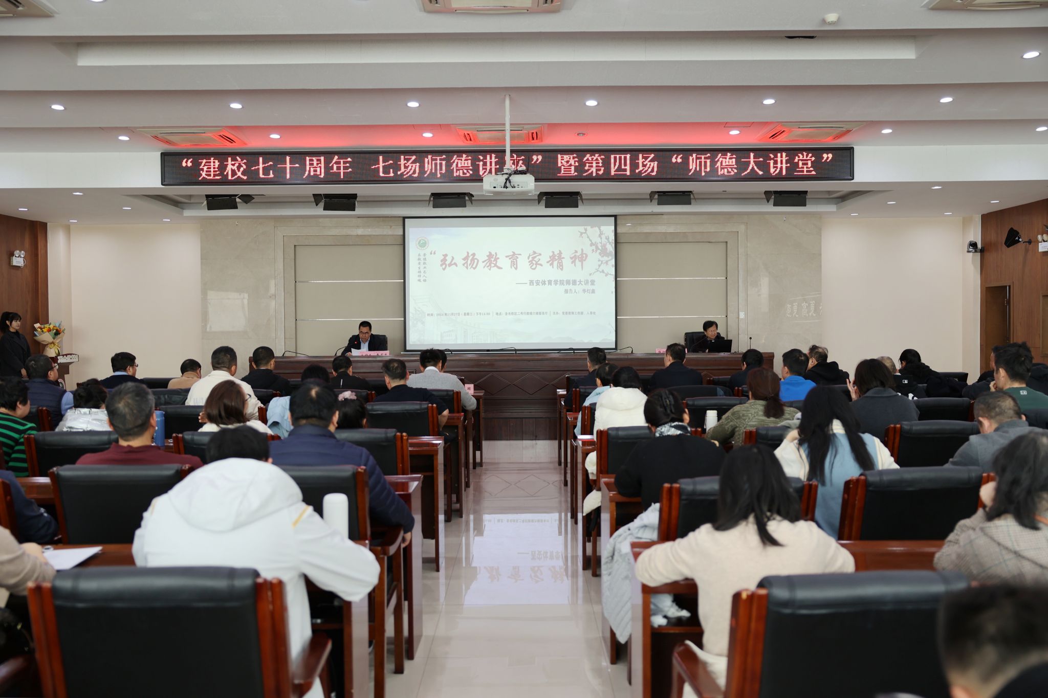 本网讯 11月27日下午,我校在含光校区2号行政楼报告厅举行建校70周年系列活动暨“弘扬教育家精神”师德大讲堂第四场报告会。邀请西安理工大学副校长、博士生导师华灯鑫作《教诲如春风,当好“引路人”——以黄大年精神构建三全育人新模式》专题报告,报告会由李富生校长主持,校党委副书记张卫国出席,党委校长办公室、人事处、教务处、科研处、研究生部、各二级学院、竞技体校等单位负责人和120名教师及辅导员代表到场聆听报告。