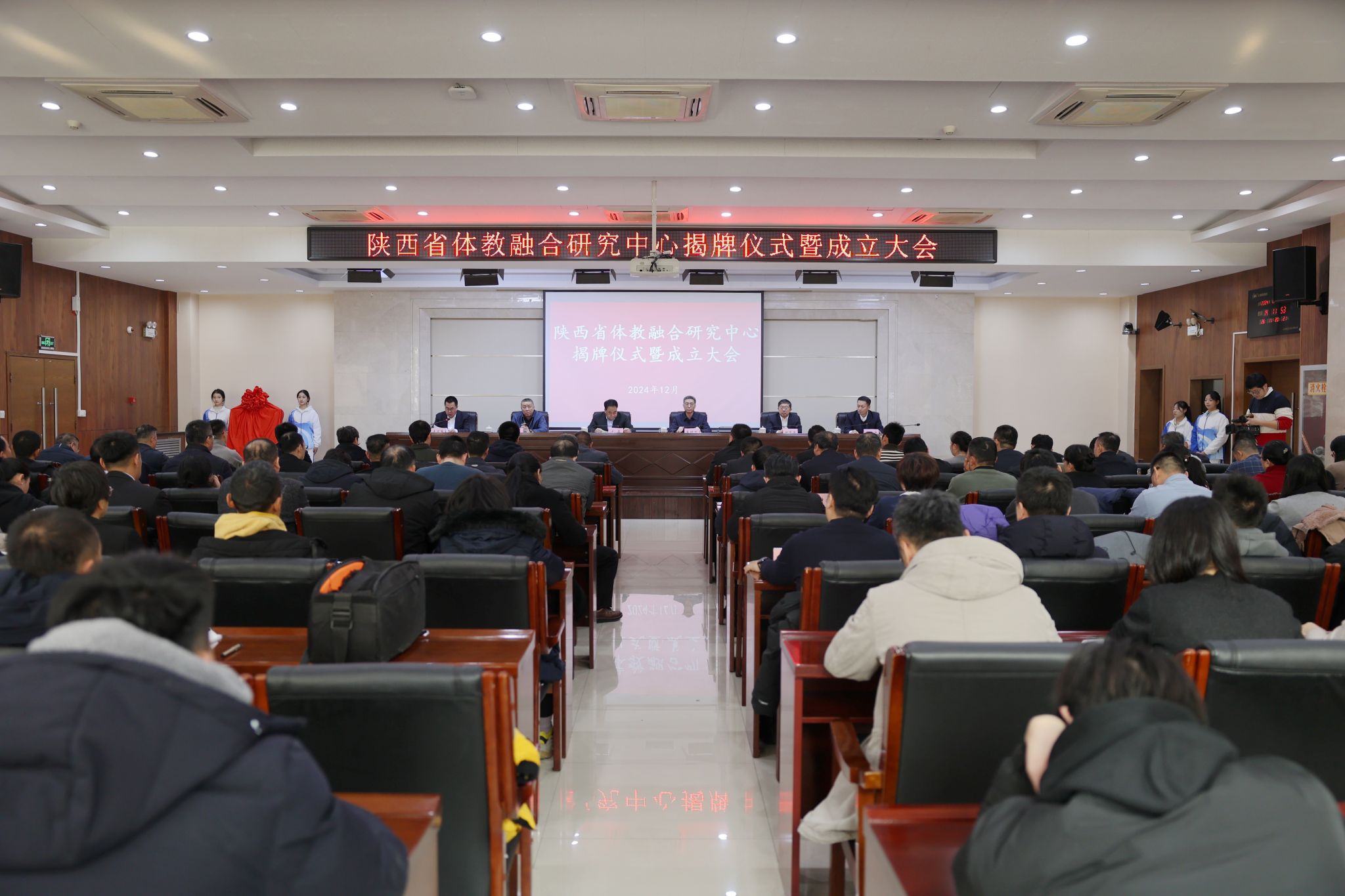 本网讯 12月20日下午,陕西省体教融合研究中心揭牌仪式暨成立大会在我校含光校区举行。省体育局党组书记、局长尤磊,省教工委委员冀映秋,省体育局党组成员、副局长邹军,校党委书记刘子实、校长李富生出席揭牌仪式。大会由我校党委副书记马海涛主持。