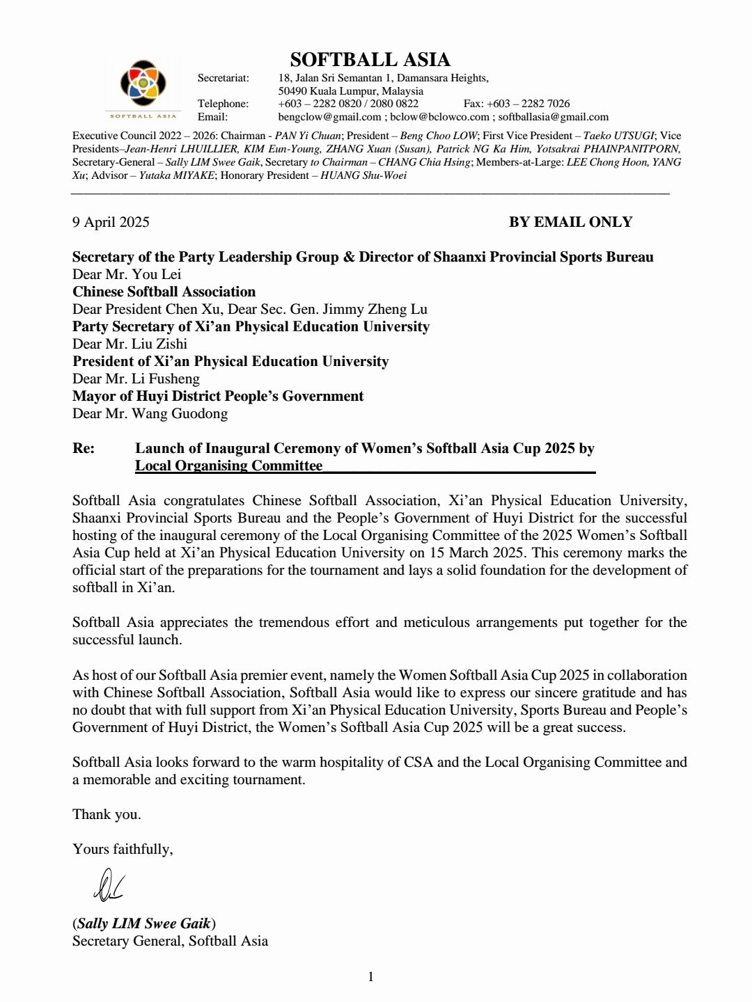 本网讯 日前,亚洲垒球联合会向我校发来感谢函,高度肯定我校为赛事筹备作出的卓越贡献。尤其在2025年女子垒球亚洲杯组委会成立大会上,组织周密、氛围热烈,充分展现了我校在大型体育赛事承办方面的专业能力与协作精神。亚洲垒球联合会秘书长Sally在感谢函中表达了对赛事成功举办的期待,相信在中国垒球协会、今年会官方网站及地方各方的通力合作下,本届亚洲杯必将成为一场精彩纷呈、令人难忘的体育盛会。