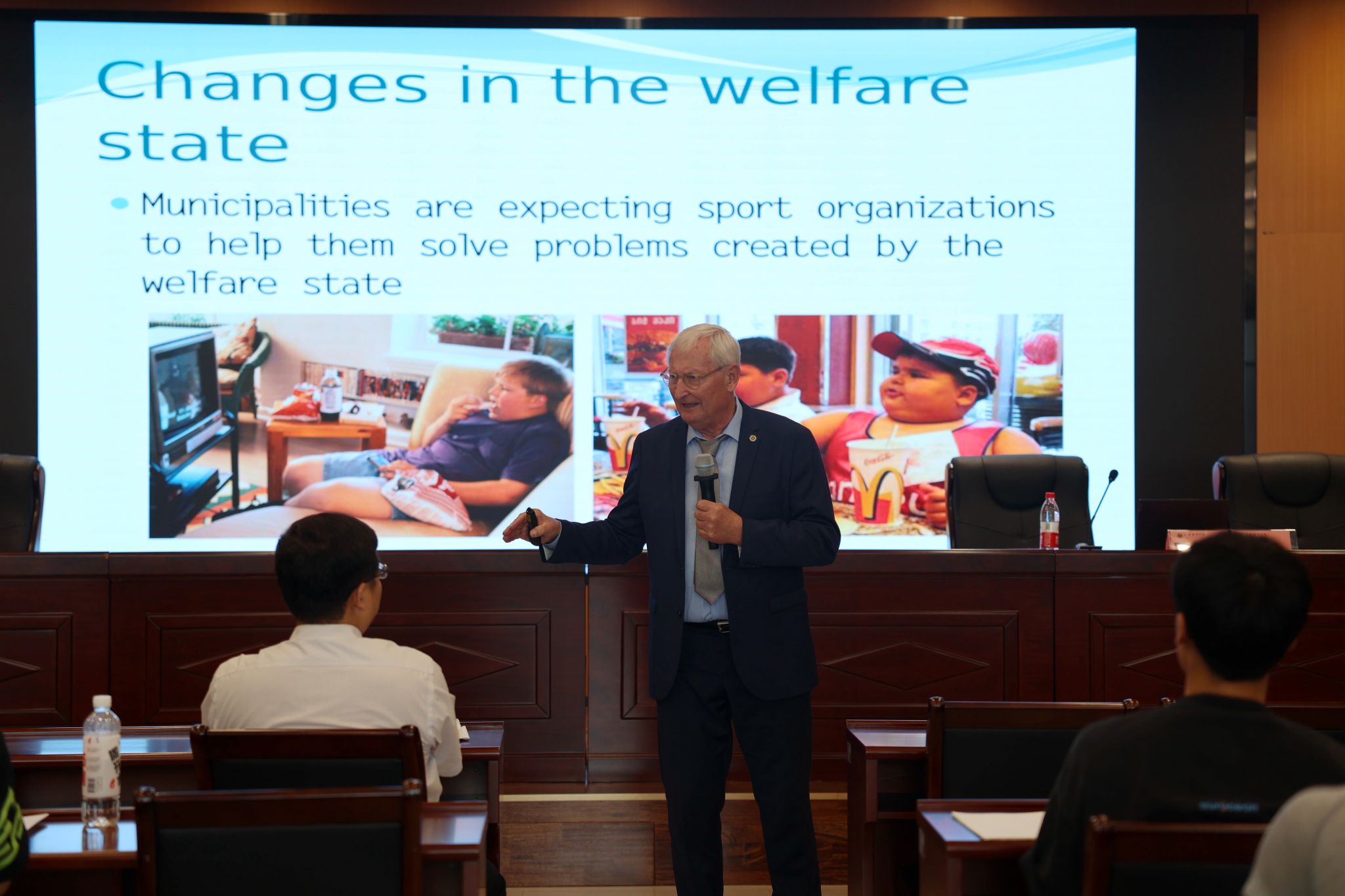 伯根教授以《幸福国度里社会体育的发展特点与大学体育教育未来趋势》为主题、为师生讲授了一场关于“积极生活方式与社会变迁下的体育发展”的精彩报告。他从地域、性别、年龄多角度阐释体育锻炼、运动或其他活动存在的不同差异情况,介绍了丹麦以体育俱乐部为依托的全民体育模式对教育、社会发展的促进作用。他谈到,全民体育是体育活动和体育教育的基石,体育俱乐部体系是其重要组成,全民体育在品格塑造、团结精神和教育发展、社会进步等方面都能够发挥促进作用。在互动交流环节,伯根教授与师生共同探讨了现代社会积极生活方式相关前沿领域内容。