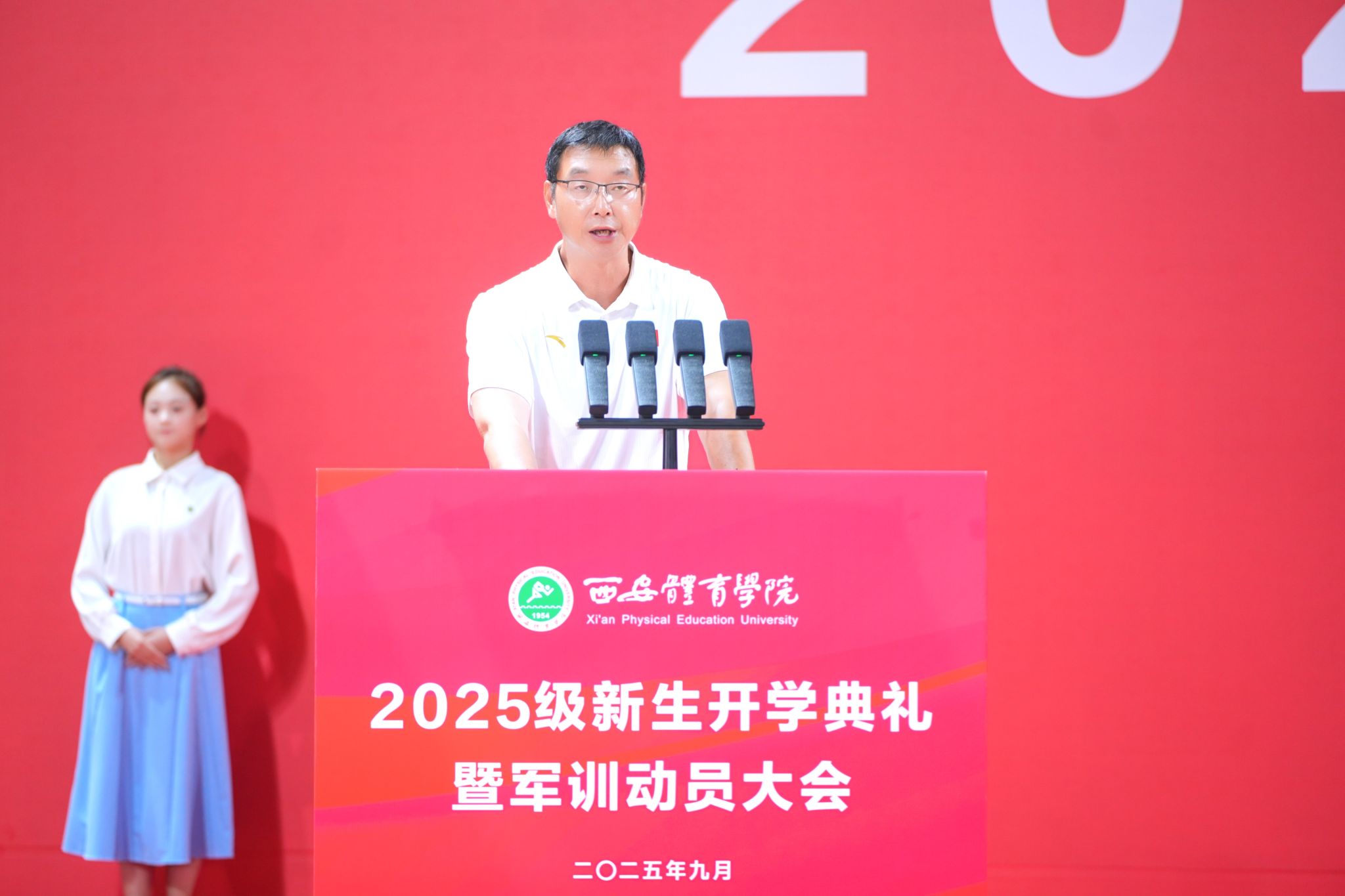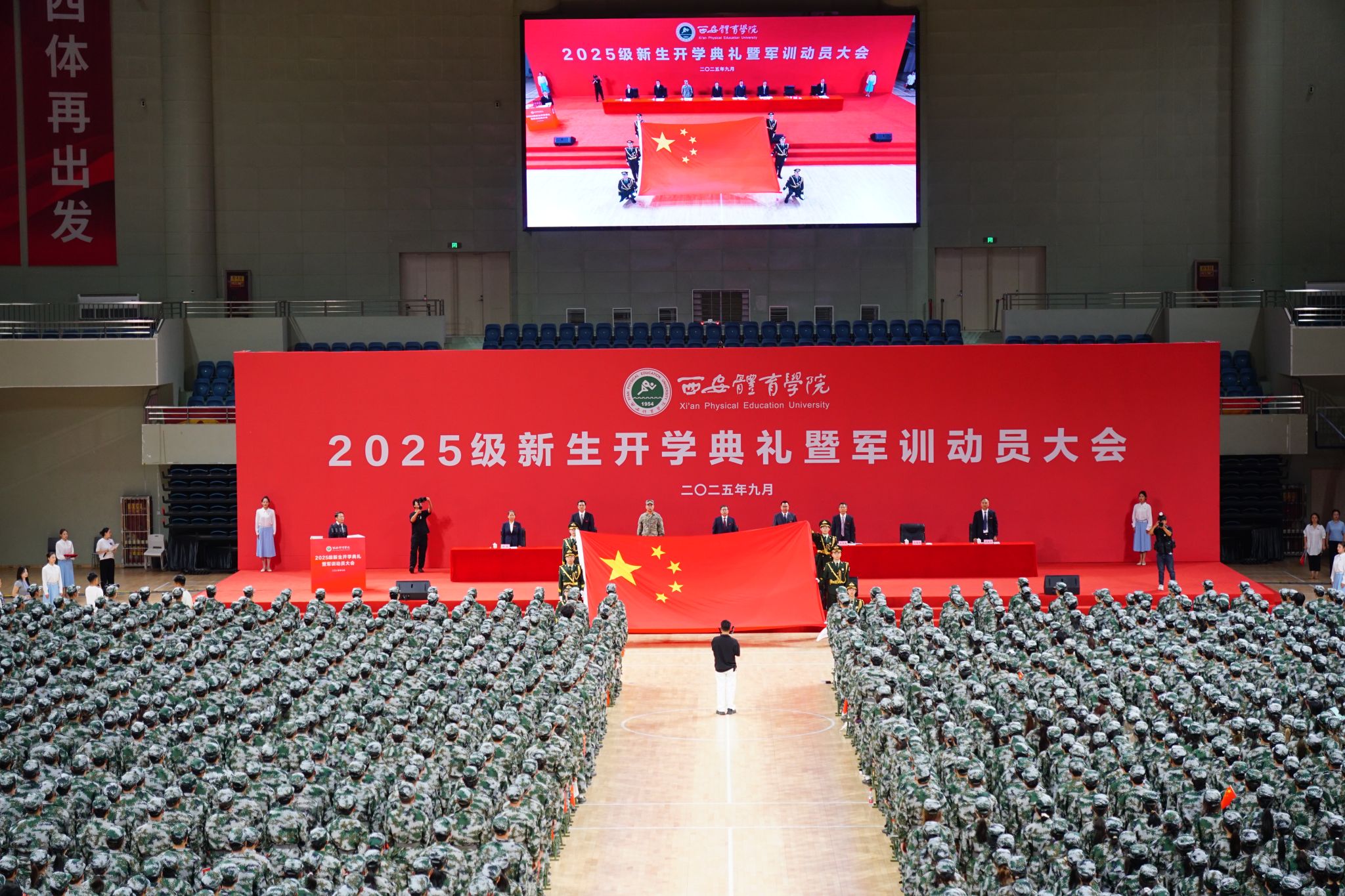 本网讯 9月8日,2025级新生开学典礼暨军训动员大会在鄠邑校区手球馆举行。校领导,承训部队官兵,各职能部门及二级学院负责人,教师代表,高年级学生代表与全体2025级新生齐聚一堂,共同见证这一庄严而热烈的时刻。大会由党委副书记马海涛主持。
