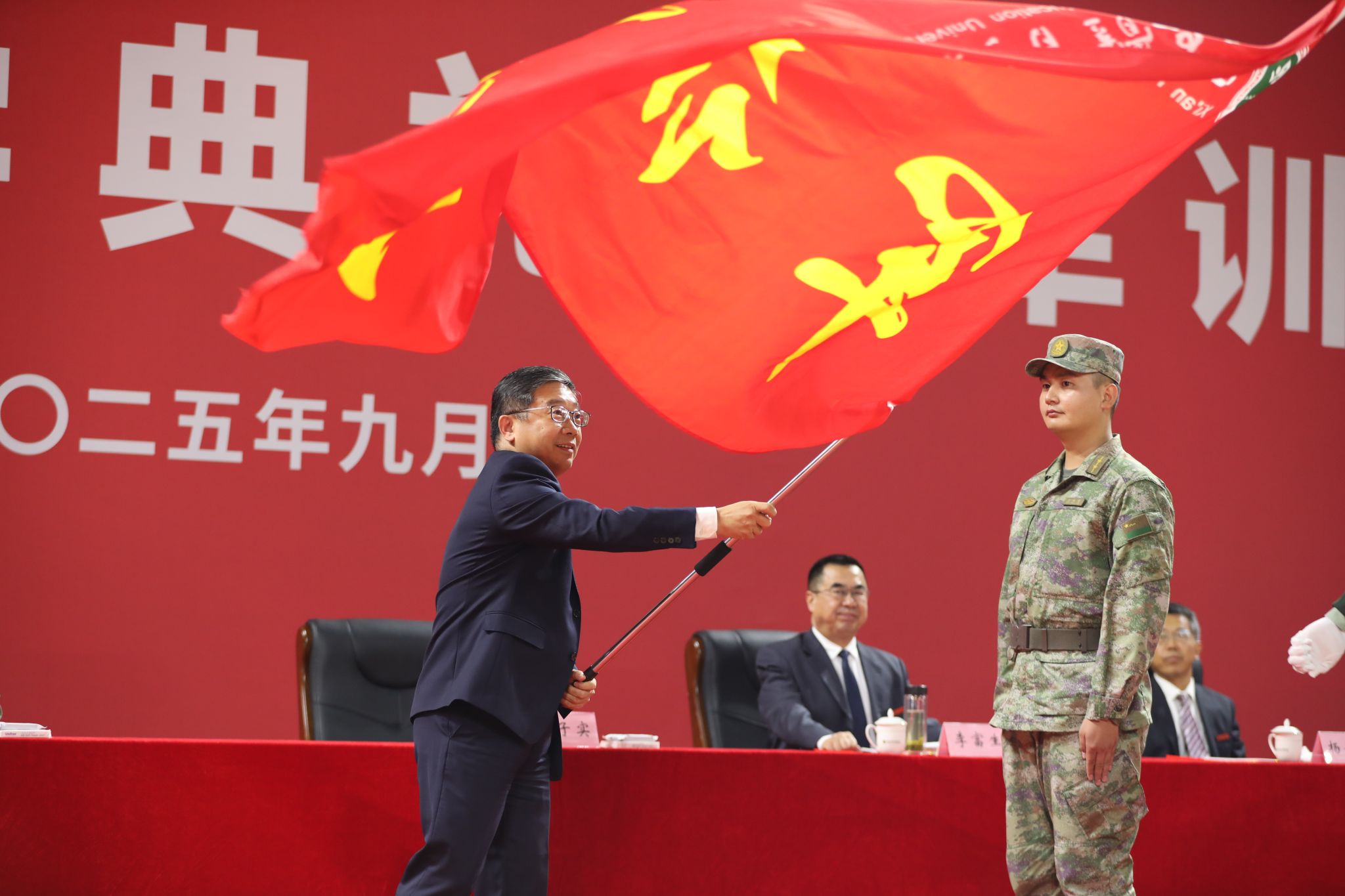 党委书记刘子实向军训团授旗。