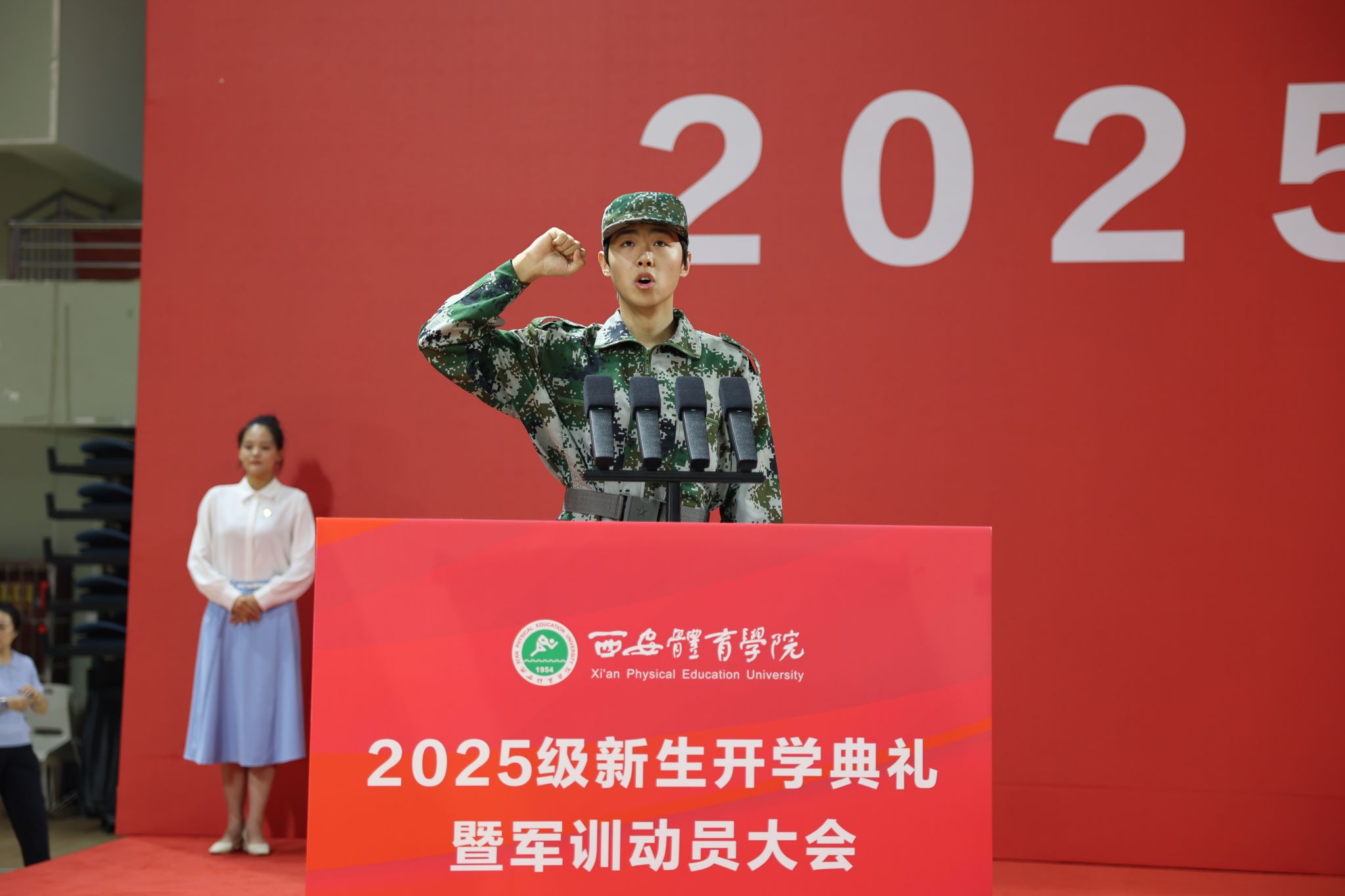全体2025级新生相互佩戴校徽并进行宣誓,体育艺术与传媒学院新生唐静沣领誓。