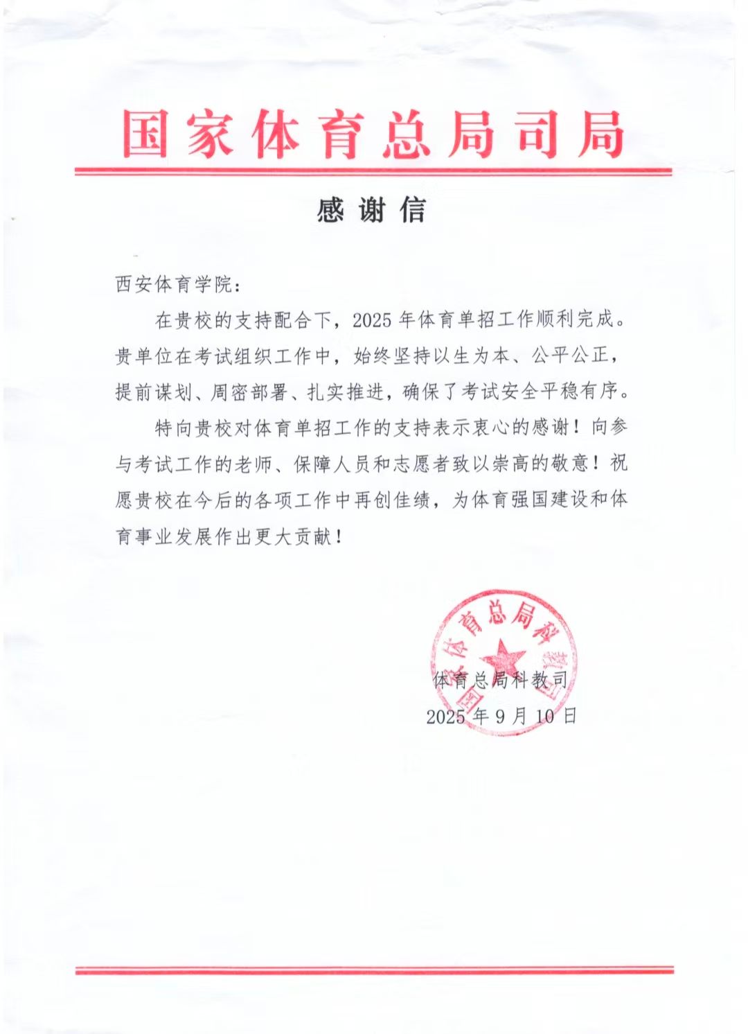 9月10日,国家体育总局科教司向我校发来感谢信,感谢“我校在单招考试组织工作中,始终坚持以生为本、公平公正、提前谋划、周密部署、扎实推进,确保了考试安全平稳有序” 。