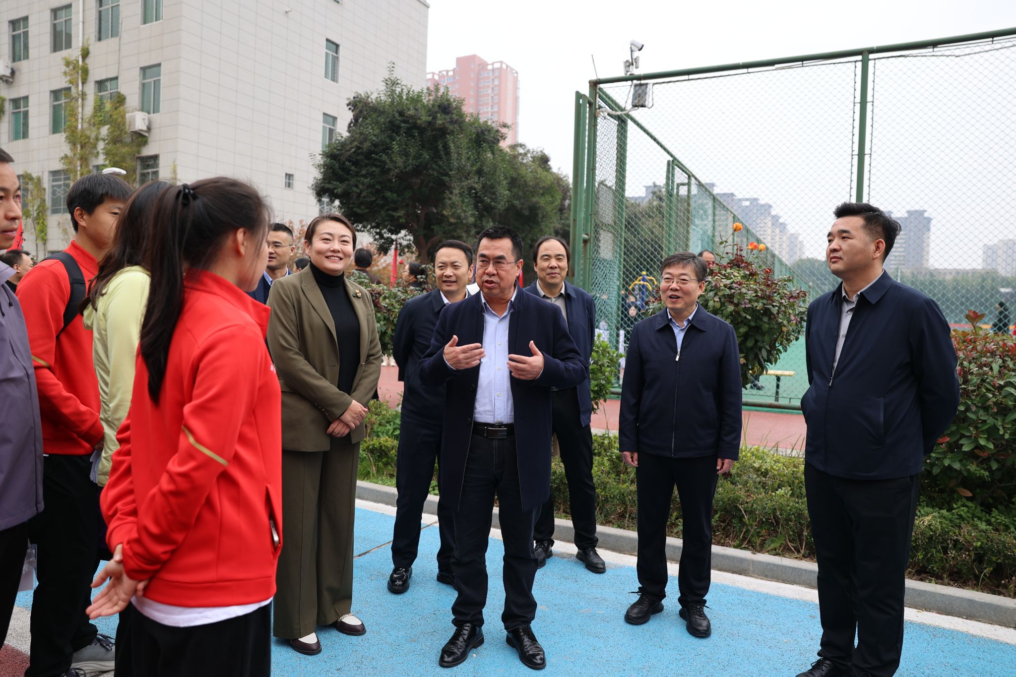 李富生还看望慰问了我校支教学生,当得知他们的工作得到支教学校的高度评价,并积极参与到2025年富平县中小学生运动会的执裁工作中时,李富生对他们的付出表示肯定,希望他们充分发挥专业特长,彰显专业能力和责任担当,确保赛事公平有序。同时,李富生嘱托支教学生以“十个助推”“十个结合”和“十个提升”为引领,在实践中淬炼成长,用实际行动诠释新时代体育人的责任与担当,推动支教工作走深走实。
