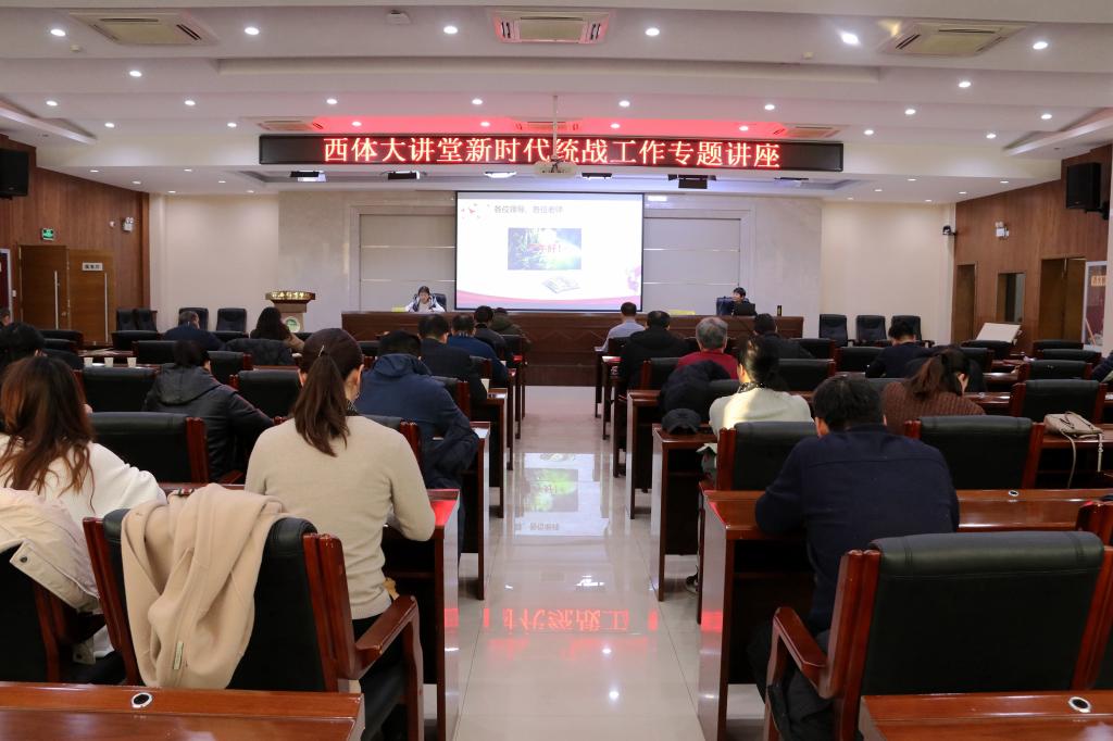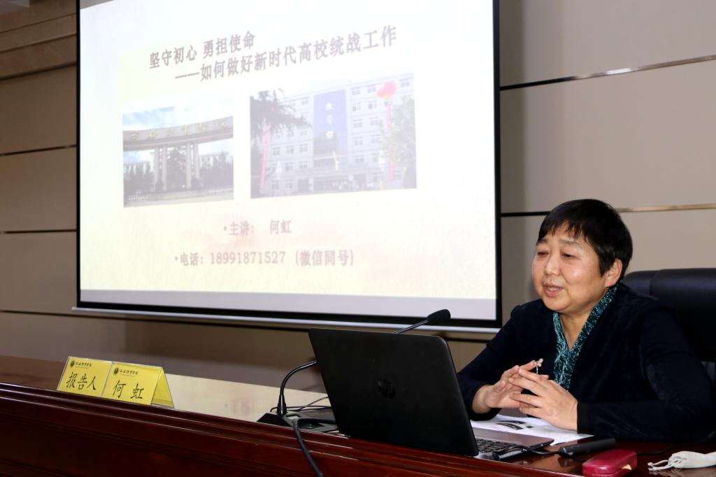本网讯 为贯彻落实党的十九届五中全会精神,深入学习习近平总书记关于进一步加强和改进统一战线工作的重要思想,切实发挥好统一战线优势,推进我校统战工作持续向好发展,12月23日下午,党委统战部邀请陕西省统一战线智库专家,陕西省教育系统干部培训专家指导委员会委员何虹教授,来校作题为《坚守初心勇担使命——如何做好新时代高校统战工作》的专题讲座。各二级单位党委(党总支、直属党支部)书记、统战委员,各党支部书记、支部统战委员,各民主党派、无党派人士及统战部全体工作人员参加了培训。讲座由党委统战部副部长杨柳主持。