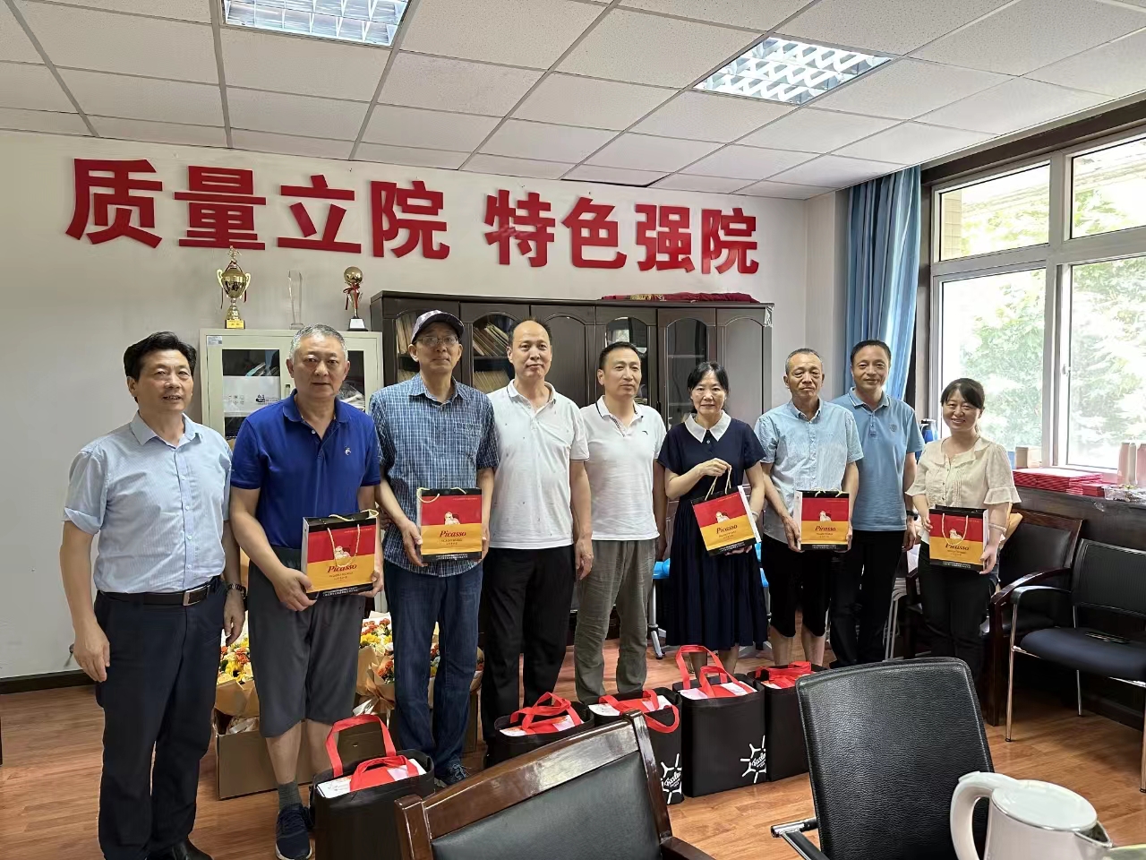 会后,张建武、杨毅谋、刘勇、何昌谋向荣休教职工颁发纪念品,并合影留念。