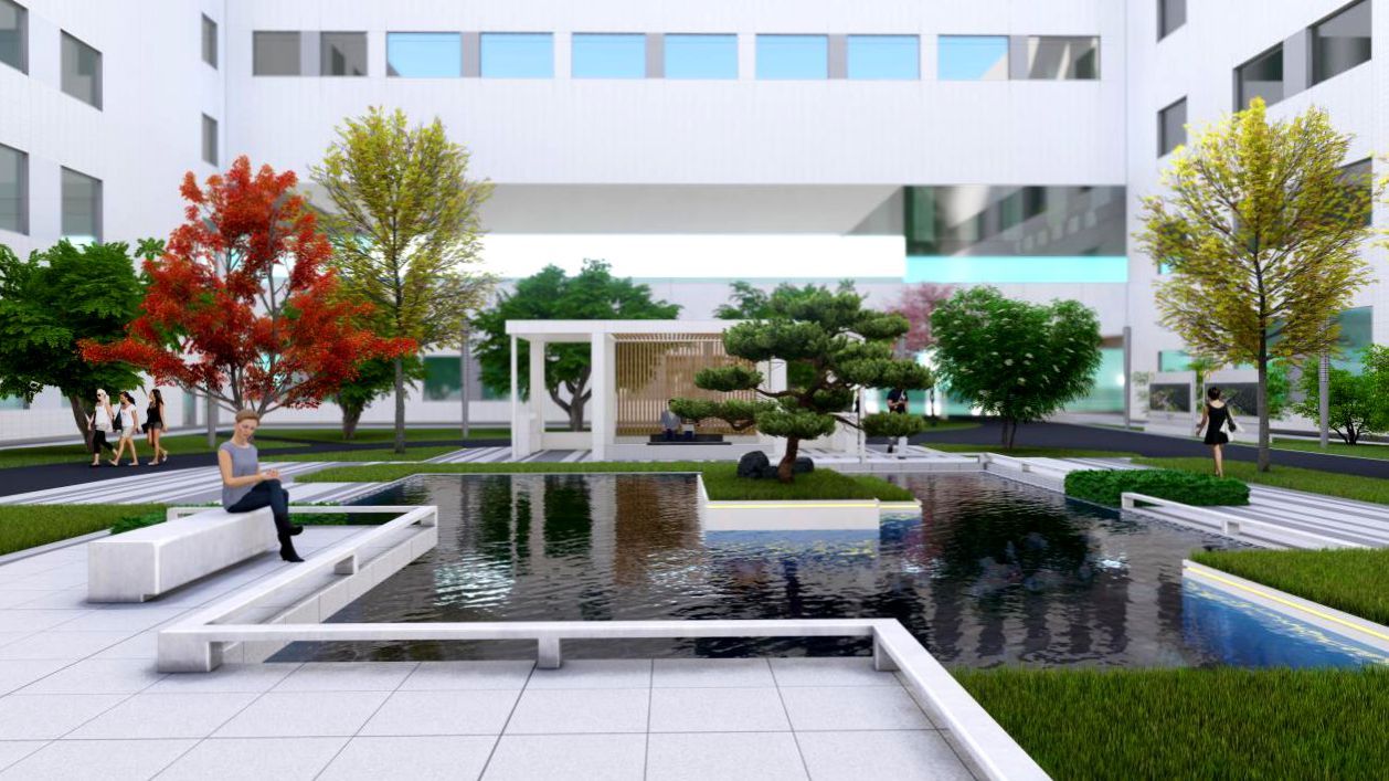 3月17日,教学综合楼室外绿化工程负责人韩永对教学综合楼北庭院提出了创新改造方案,建议将现有草坪更改为鱼池,池中间设置低高度喷泉,带动水池氧气循环。