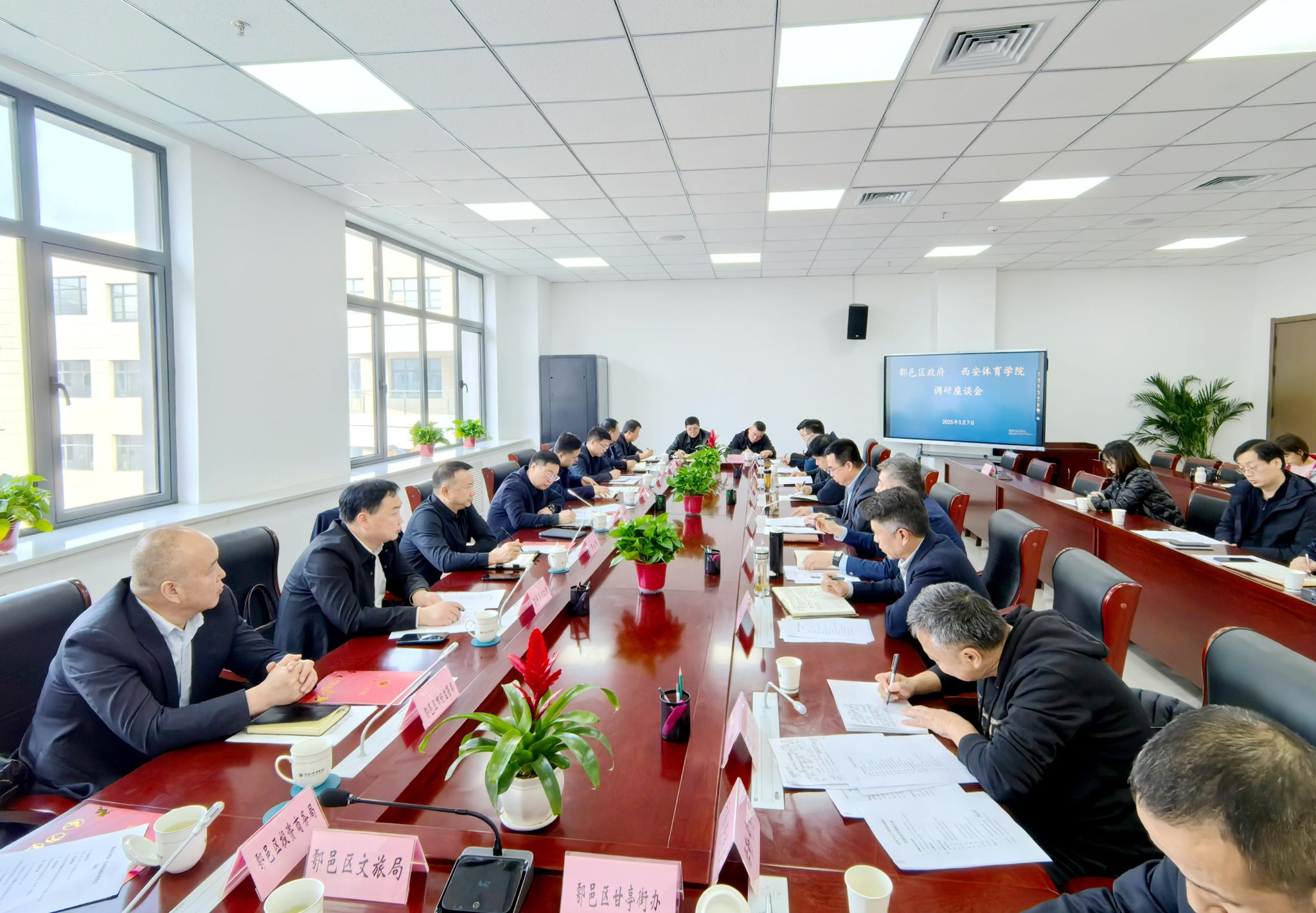 李富生表示,鄠邑区对学校工程建设、赛事保障、校区周边环境整治、建设职工住房的支持力度前所未有,对鄠邑区委、区政府长期以来对学校的关心和支持表示最诚挚的感谢。他介绍了学校今年开展“十大攻坚战”的整体安排和校园建设、大型赛事筹备等重点工作,表示学校将充分发挥体育教育资源优势,继续支持鄠邑区教体文卫事业发展。一是继续开展体育支教,通过长期派驻支教志愿者和助教,打造体育特色学校,提高鄠邑中小学体育教育水平。二是广泛开展全民健身,学校将组织师生深入学校、社区、工厂开展全民健身“三进三讲”活动,传播健康知识,引领科学健身;同时在保障教学训练需求的基础上,有序推进场馆开放,使“全运遗产”惠及于民。三是推进产学研深度融合转化,在“体育+”领域探索更多合作空间,为鄠邑区教体事业和社会经济质量发展注入新活力。