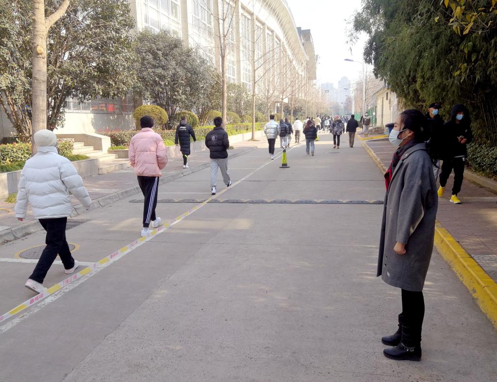 在协助武保处和二级学院做好核酸检测队伍秩序维护过程中,大家细心观察口罩未按规范佩戴的、路途中前后交谈的、未保持安全距离的学生,同志们不时提醒叮嘱。尤其在田径场与奥林匹克花园路段交叉处,大家还不停对来往垃圾倒运车和防疫车进行指挥,确保核酸检测队伍安全有序通过。