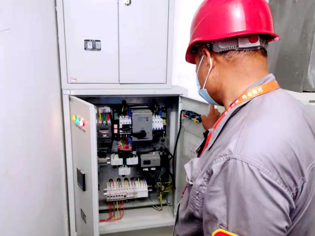 电力保障人员检查曲棍球馆二楼电力设施