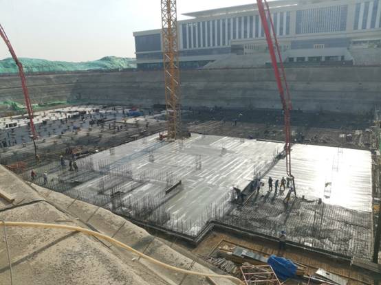 中段施工进展顺利,基础筏板底筋直螺纹套筒连接及绑扎工作已全部完成,面筋直螺纹套筒连接及绑扎完成90%,墙柱基础插筋完成70%,基础筏板砼浇筑完成90%,剩余部分将尽快完成,确保中段基础工程的稳定性和安全性。