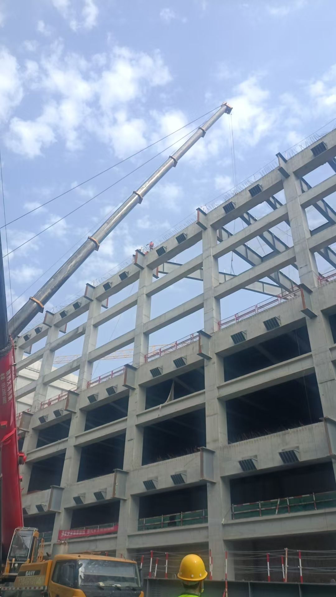 截止5月26日,风雨操场项目钢结构工程取得阶段性进展。项目已完成13根钢结构的拼接和10根的焊接工作,成功吊装16根钢框梁,本周内将完成屋面钢梁吊装整体作业。