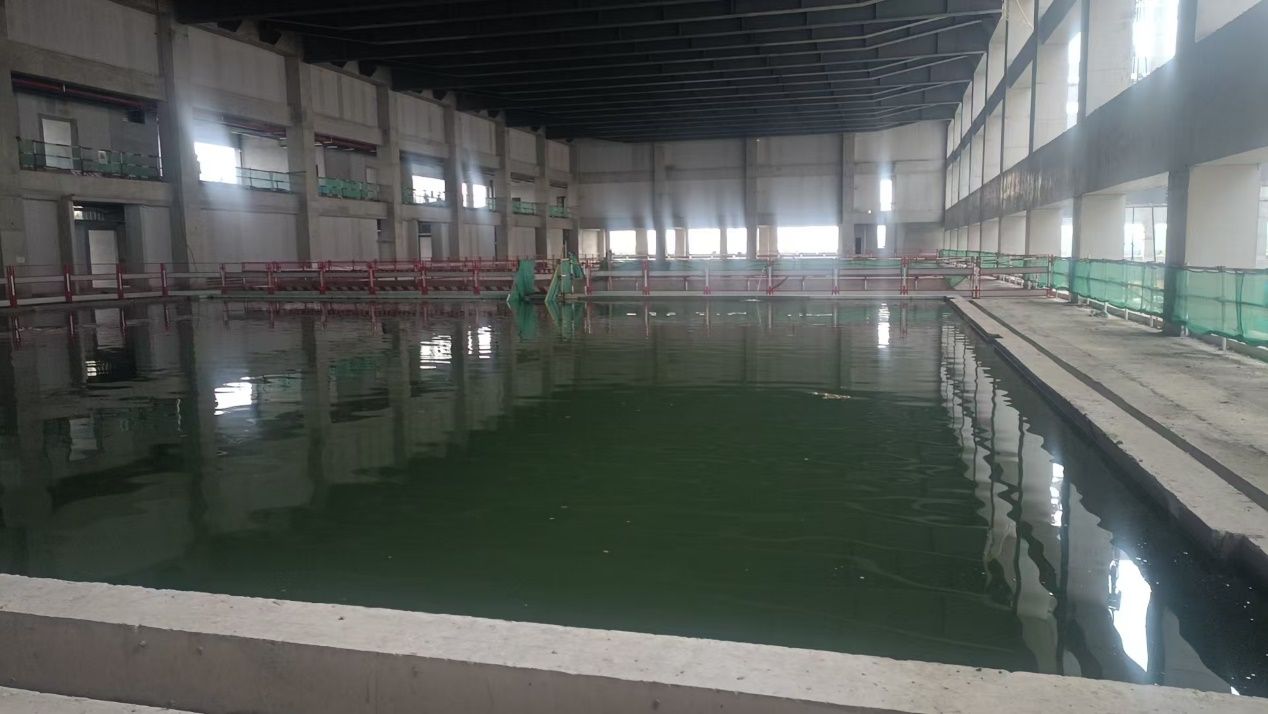 室内泳池区域施工同步推进,热身池蓄水工作已顺利完成,标准池预计于下周完成蓄水测试。