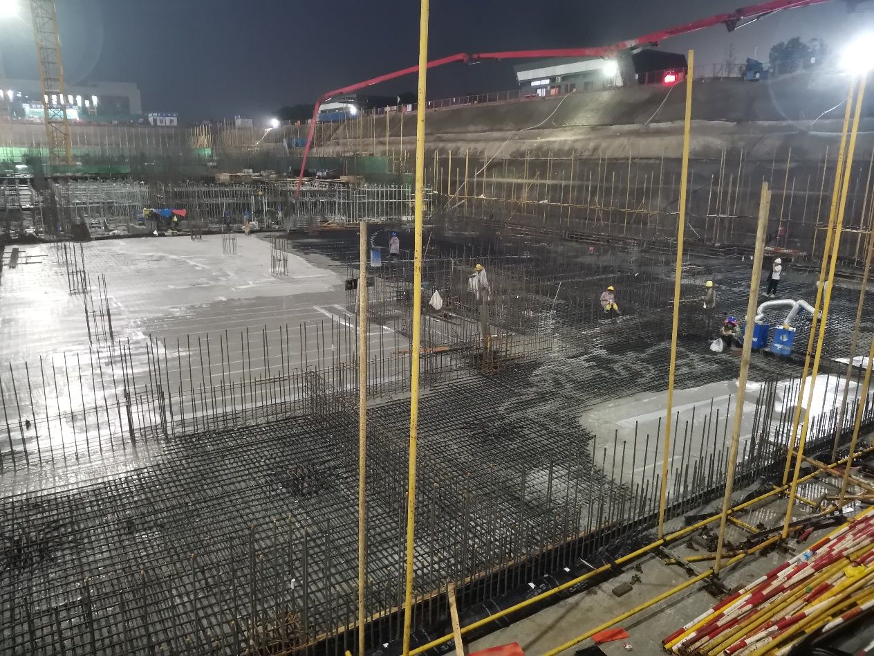 南段负三层顶板钢筋绑扎全部完成,砼浇筑过半,工序穿插提升效率。