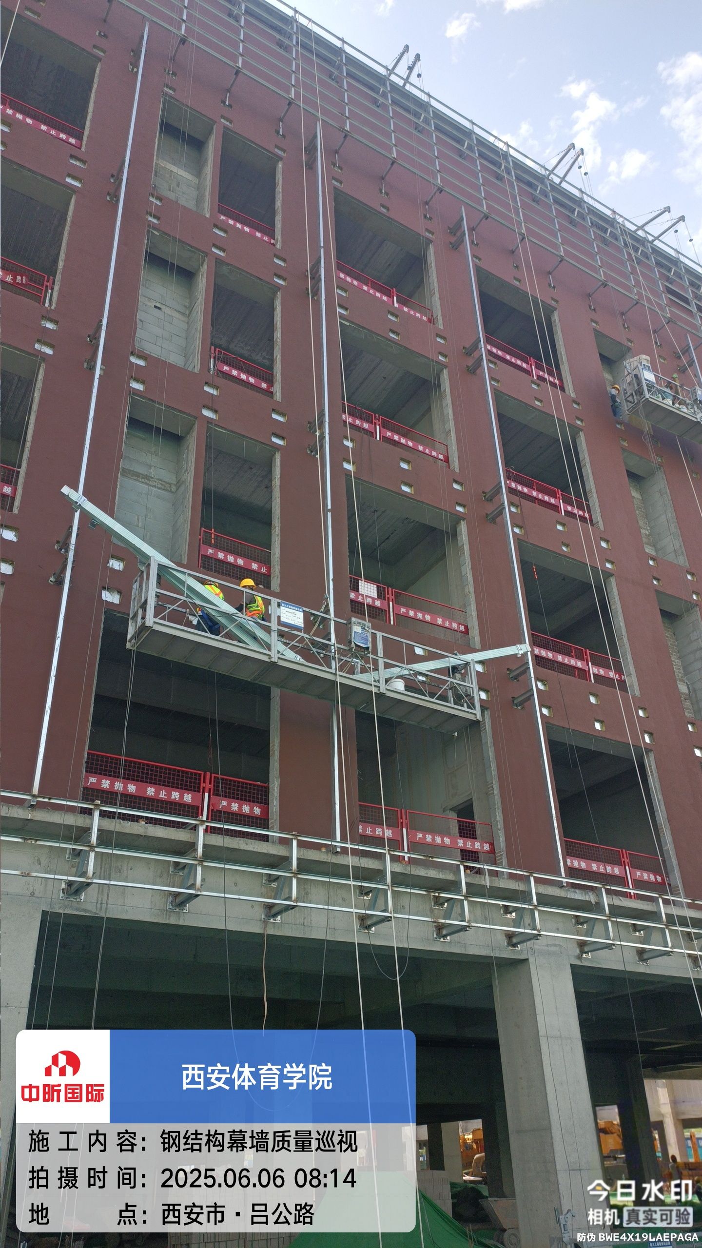 截止6月6日,鄠邑校区风雨操场项目迎来关键施工节点,施工团队抢抓晴好天气,组织工人身着专业安全装备,借助标准化吊篮开展凌空作业,标志着室外幕墙工程正式进入高空攻坚阶段。