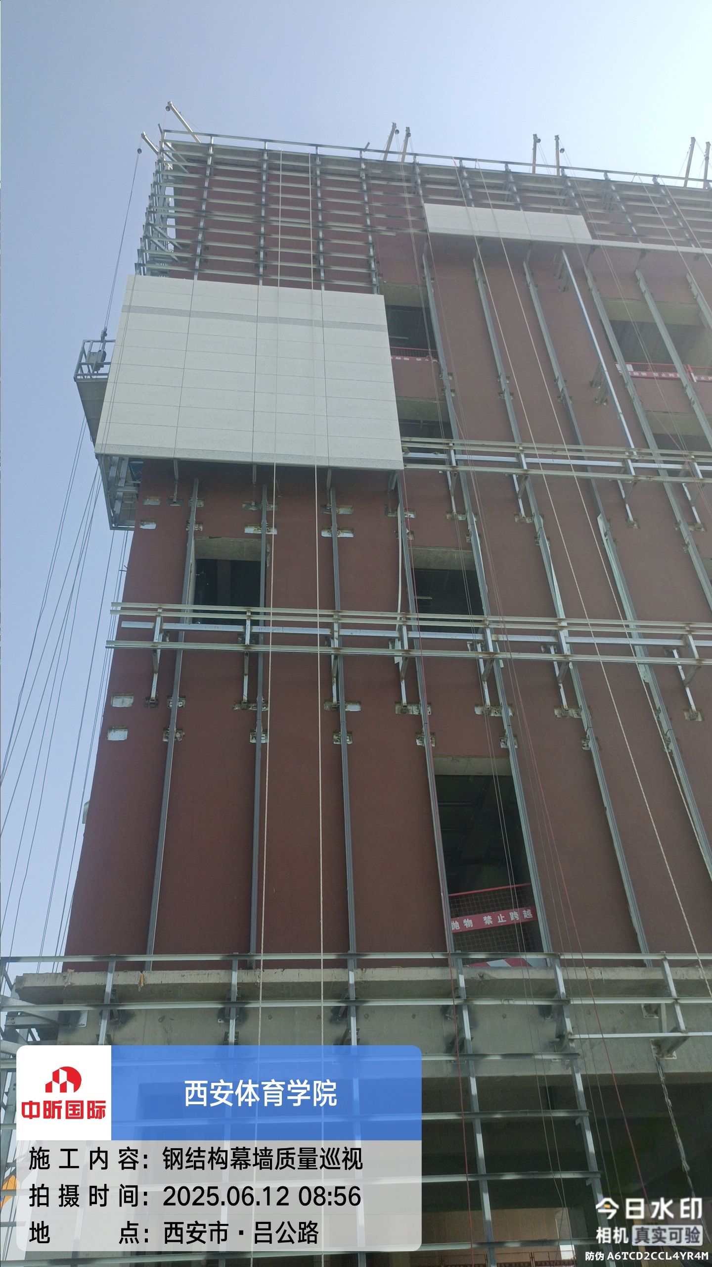 建筑外立面钢结构幕墙框架已初步成型,金属龙骨排布规整,连接节点工艺规范,工人正为后续面板安装做准备,巡视组重点核验构件焊接质量、防锈处理及安装精度。