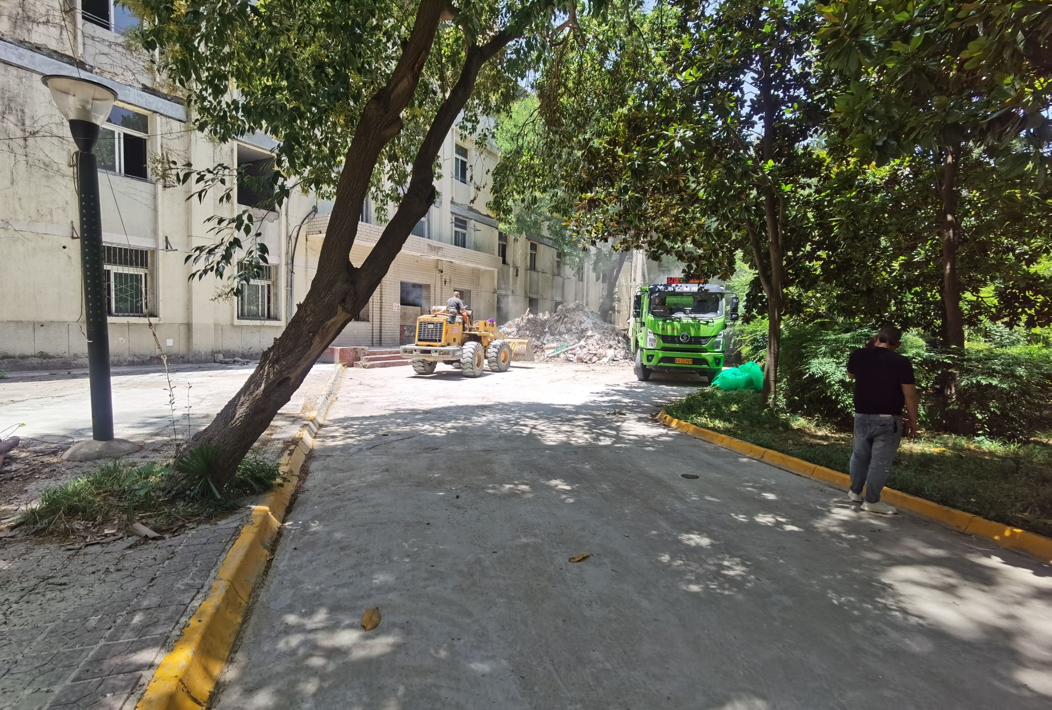 施工团队采用“人工+机械”协同模式攻坚收尾作业,对剩余建材、可复用器材分类收纳,配合装载机与渣土车清运拆除废料、清理场地,拆除施工围挡,校区空间基本得到恢复。