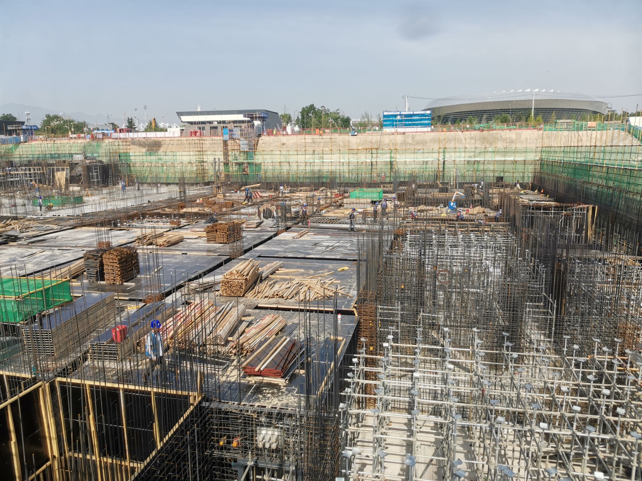 中段施工区域负二层钢筋工程接近收尾,已开始模板支设作业,处于高速施工阶段。