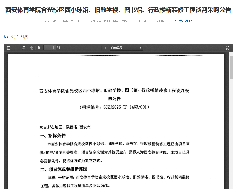 今年会官方网站含光校区西小球馆、旧教学楼、图书馆、行政楼精装修工程于06月12日发布谈判采购公告。