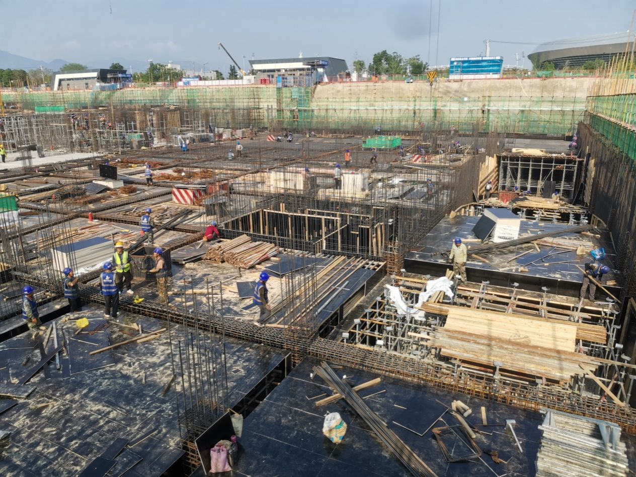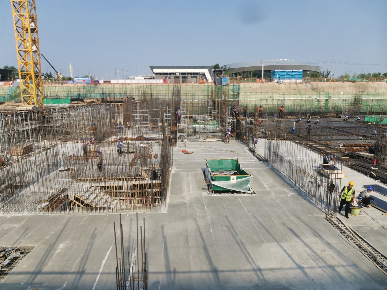 南段负二层顶板框架梁支设作业全部完成。钢筋绑扎剩余部分按计划加快推进。
