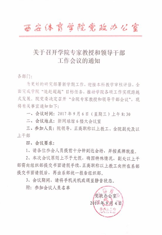 学院定于9月6日(周三)上午8:30,在新网球馆六楼大会议室召开学院专家教授和领导干部工作会议,请相关与会人员准时参会。