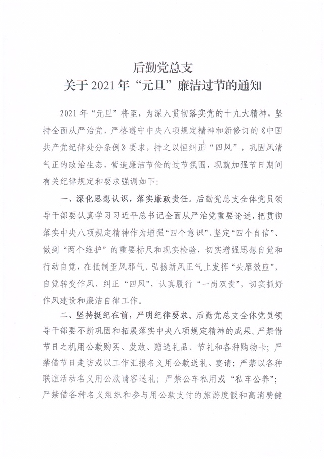 后勤党总支关于2021年“元旦”廉政过节的通知