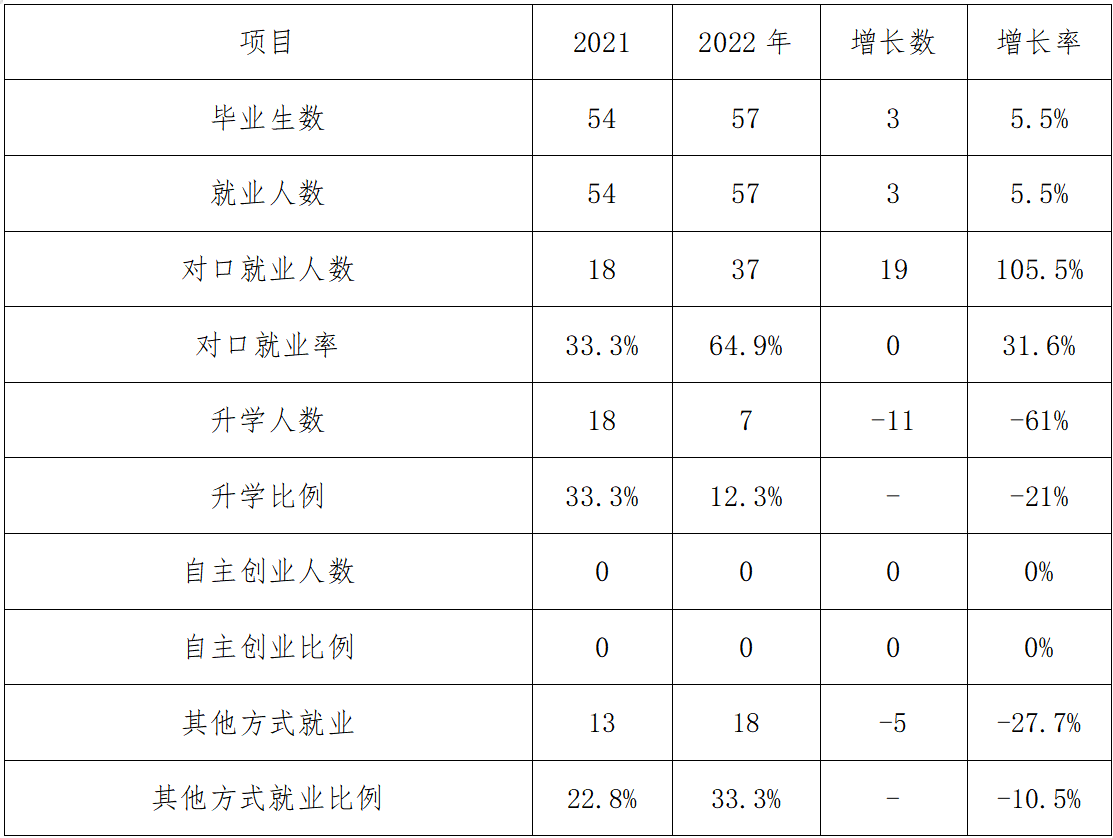 我校只设置一个专业,2022年学生就业去向情况:毕业总人数57人,就业57人。直接就业37人,占就业人数64.9%;升入各类高一级学校的毕业生数为7人,占就业人数12.3%;其它方式就业13人,占就业人数22.8%。