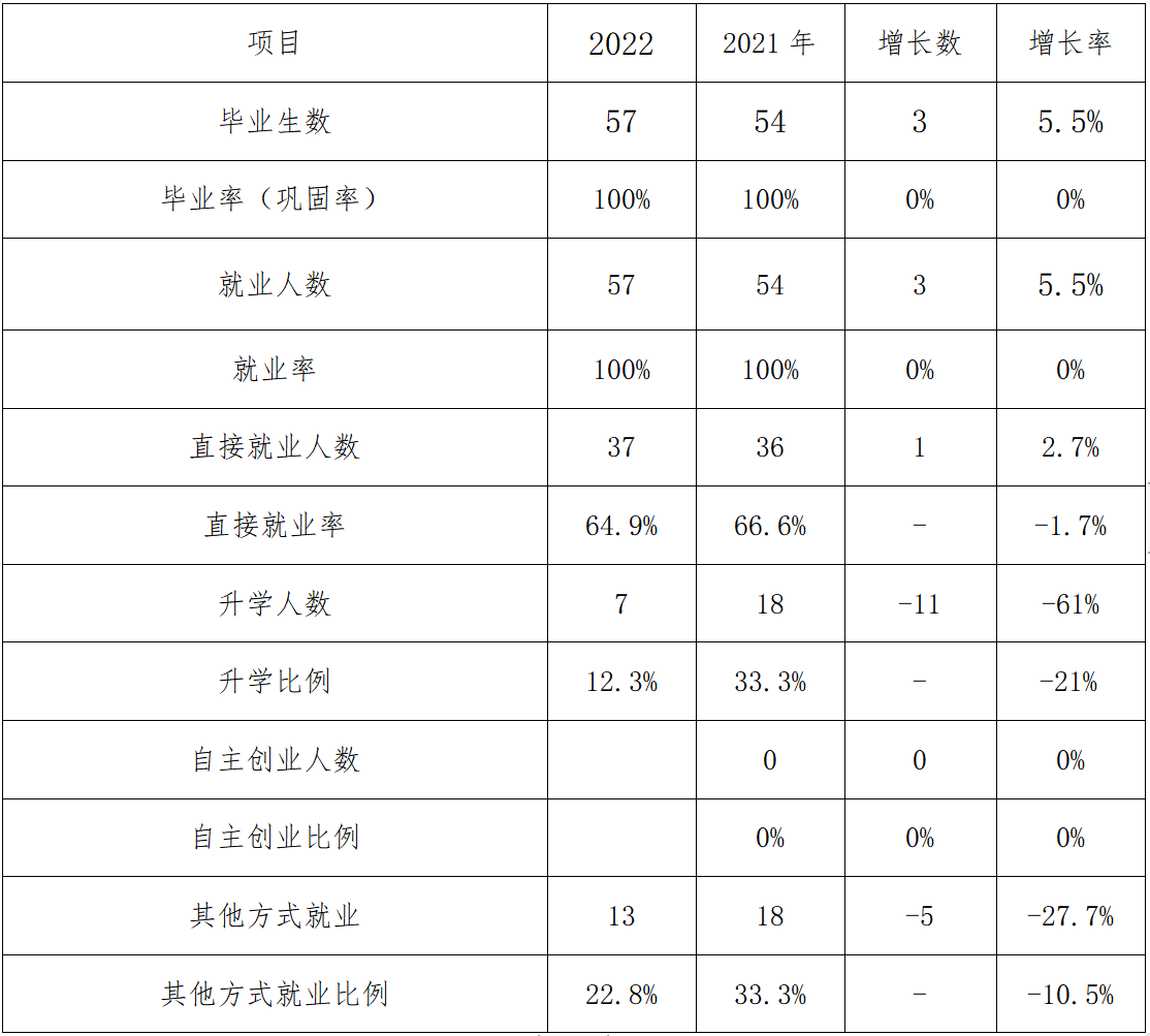2022年应届毕业生57人,就业学生数为57人,平均就业率为100% 。直接就业人数37人,对口就业率64.9%。