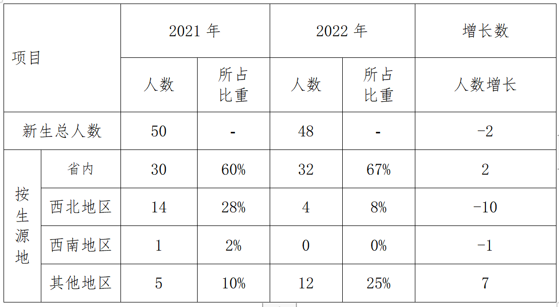 2022年,学校共录取全日制新生48人,比2021年减少2人,增加率-4%。按生源地分,新生生源地为省内:32人。具体情况见下表: