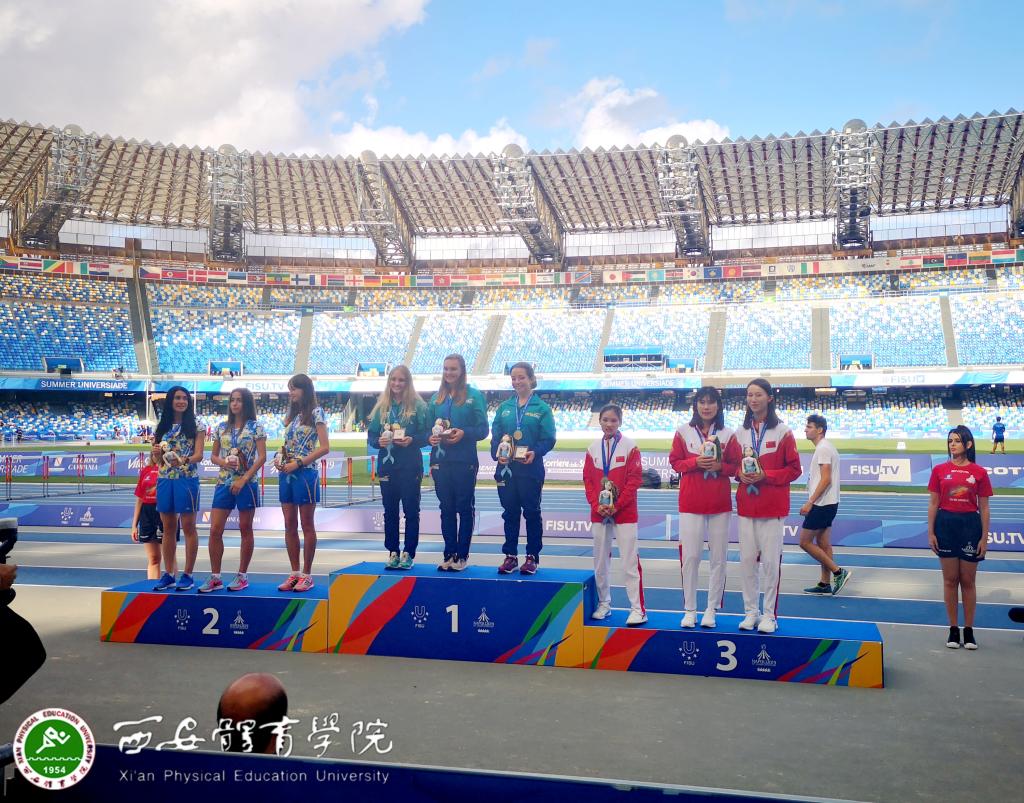 本网讯 7月12日,在意大利那不勒斯举行的第三十届世界大学生夏季运动会上,我校学生苏文秀与队友王娜、刘玉顽强拼搏,发挥出色,共同获得女子20公里竞走团体季军。