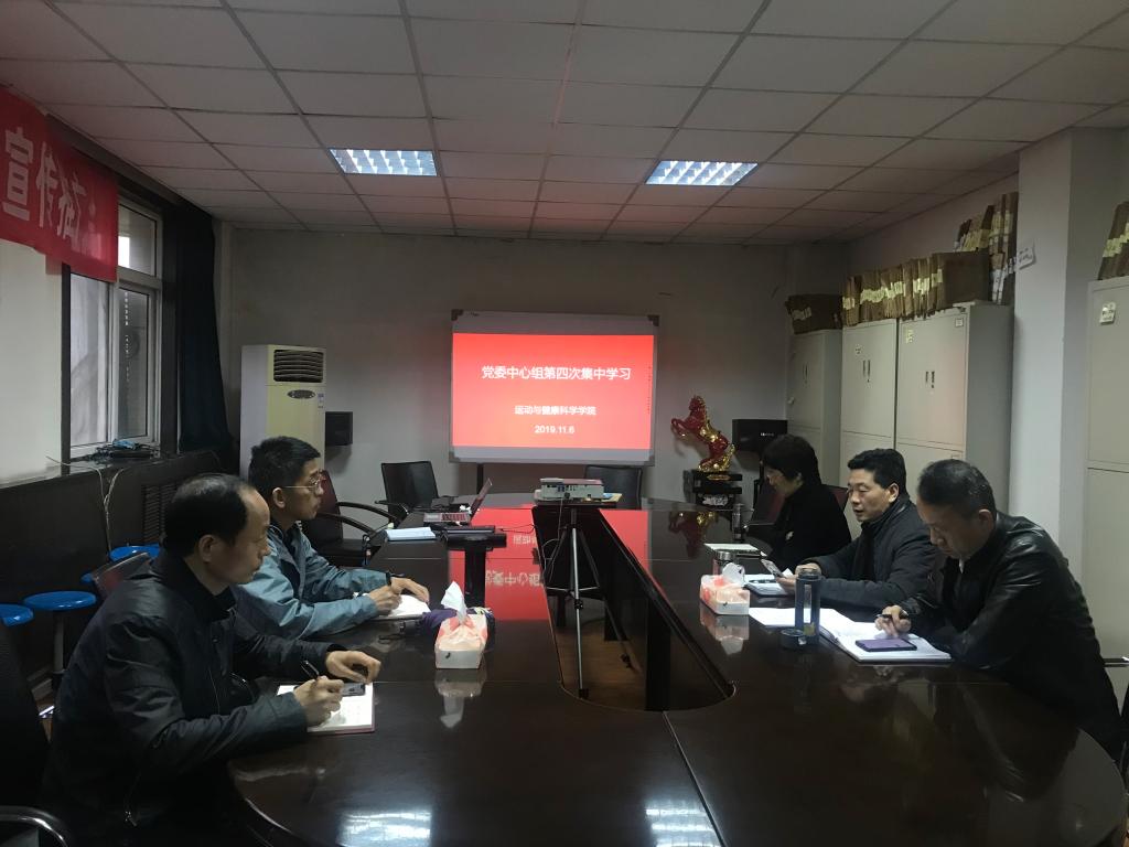 2019年11月6日 运动与健康科学学院在实验楼五楼会议室召开党委中心组第四次集中学习,学院党委书记刘勇带领党委中心组成员学习了十九届四中全会精神的部分内容,并要求会后大家自学剩余部分内容,领会精神与自我工作结合,做好本职工作。