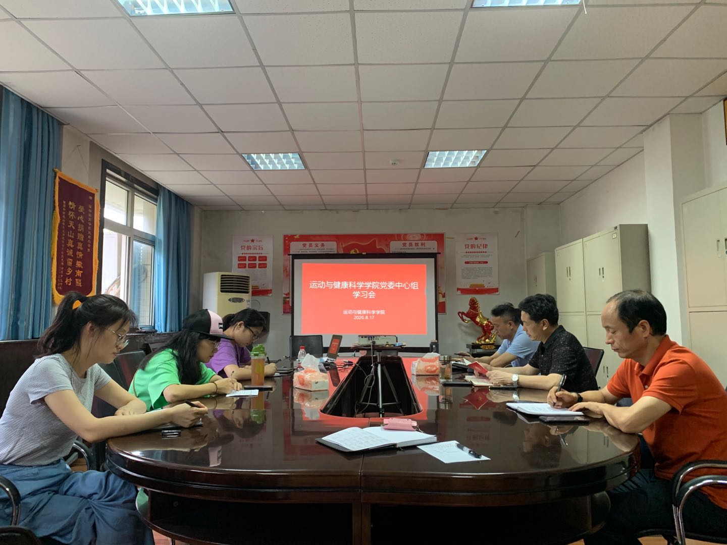 2020817日运动与健康科学学院党委中心组扩大学习会议在实验楼五楼会议室召开。运动与健康科学学院领导班子、院办人员及辅导员参加此次会议。