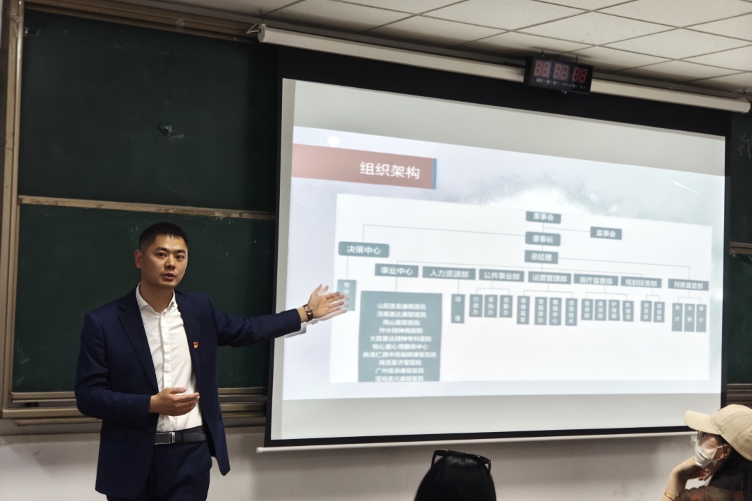 首先,集团的杨经理为我们讲解了企业概况,并发放了宣传手册。我们了解到了公司组织架构,各地的事业中心:洛南善达康复医院,大荔善达精神专科医院,广州圣泉康复医院等等;以及经营范围:二类、三类医疗器械的销售;保健食品和预包装食品销售;医院建设及管理;医疗器械的研发;一类医疗器械的销售;生物科技领域的技术研发、技术咨询和医疗设备租赁等。后面,杨经理对同学提出的问题也进行了一对一解答。
