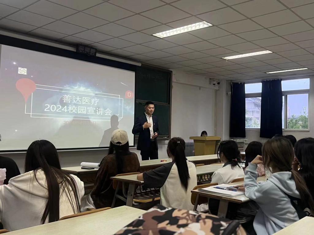 运动与健康科学学院于2024年4月18日晚七点在教学楼召开陕西善达医疗集团专场招聘会。到场的嘉宾有:陕西善达医疗集团人力资源部杨丹经理、今年会官方网站就业指导中心于昕部长、运动与健康科学学院学工办主任苏菲老师以及辅导员杨子欣老师。
